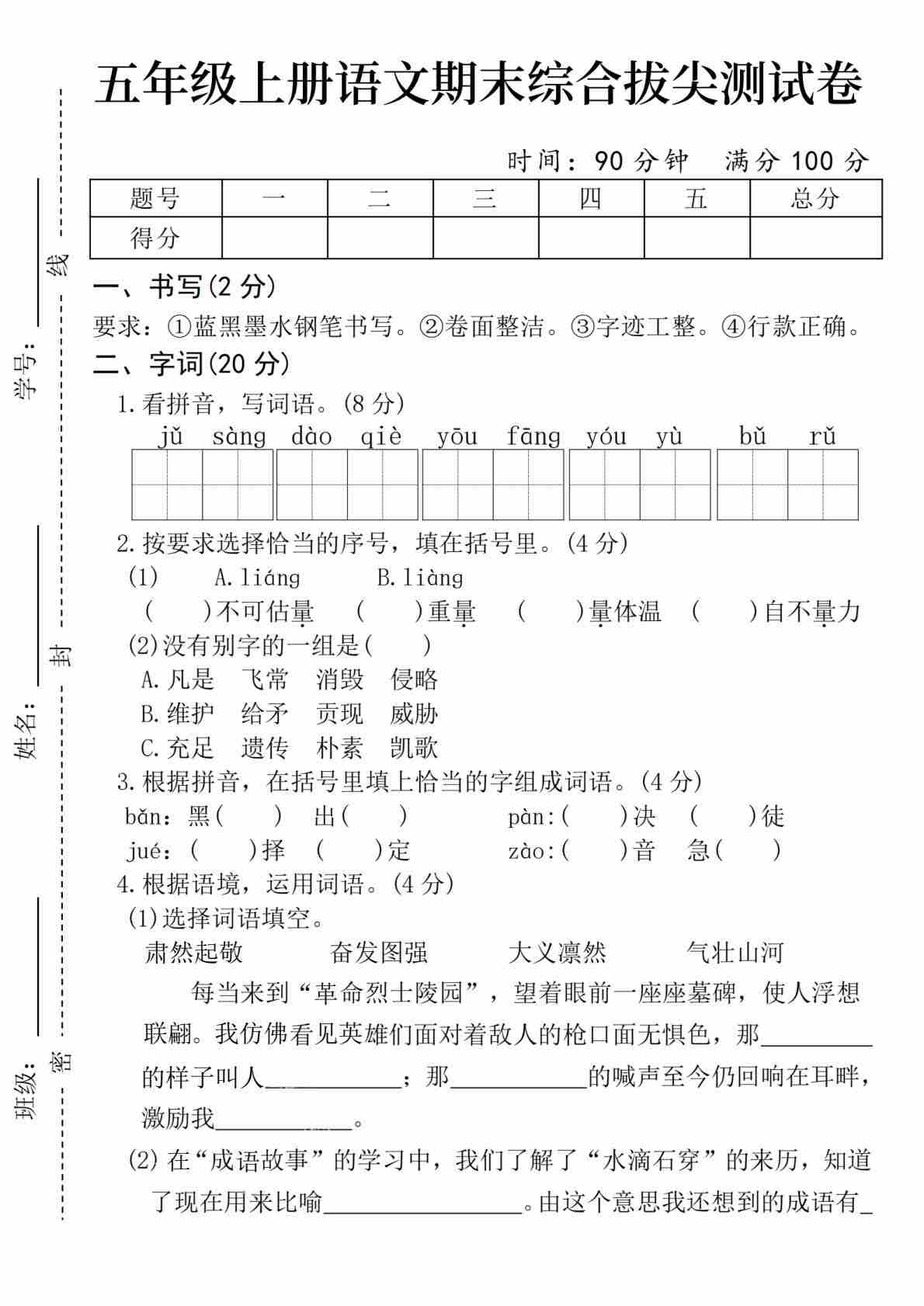 五(上)语文综合拔尖测试卷-ju sang-SY
