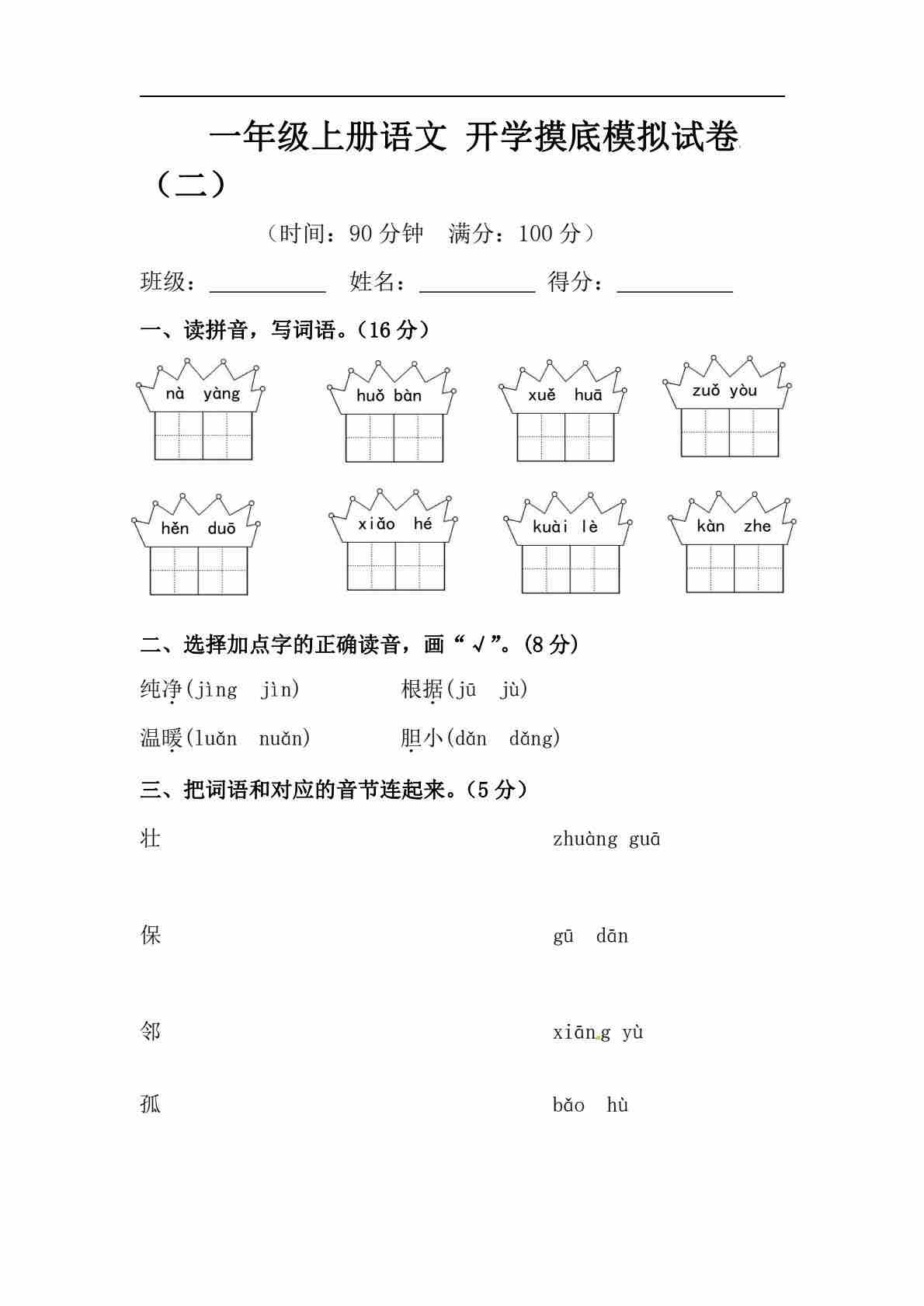 一(上)语文 开学摸底模拟试卷(二)(人教部编版,含答案)(1)