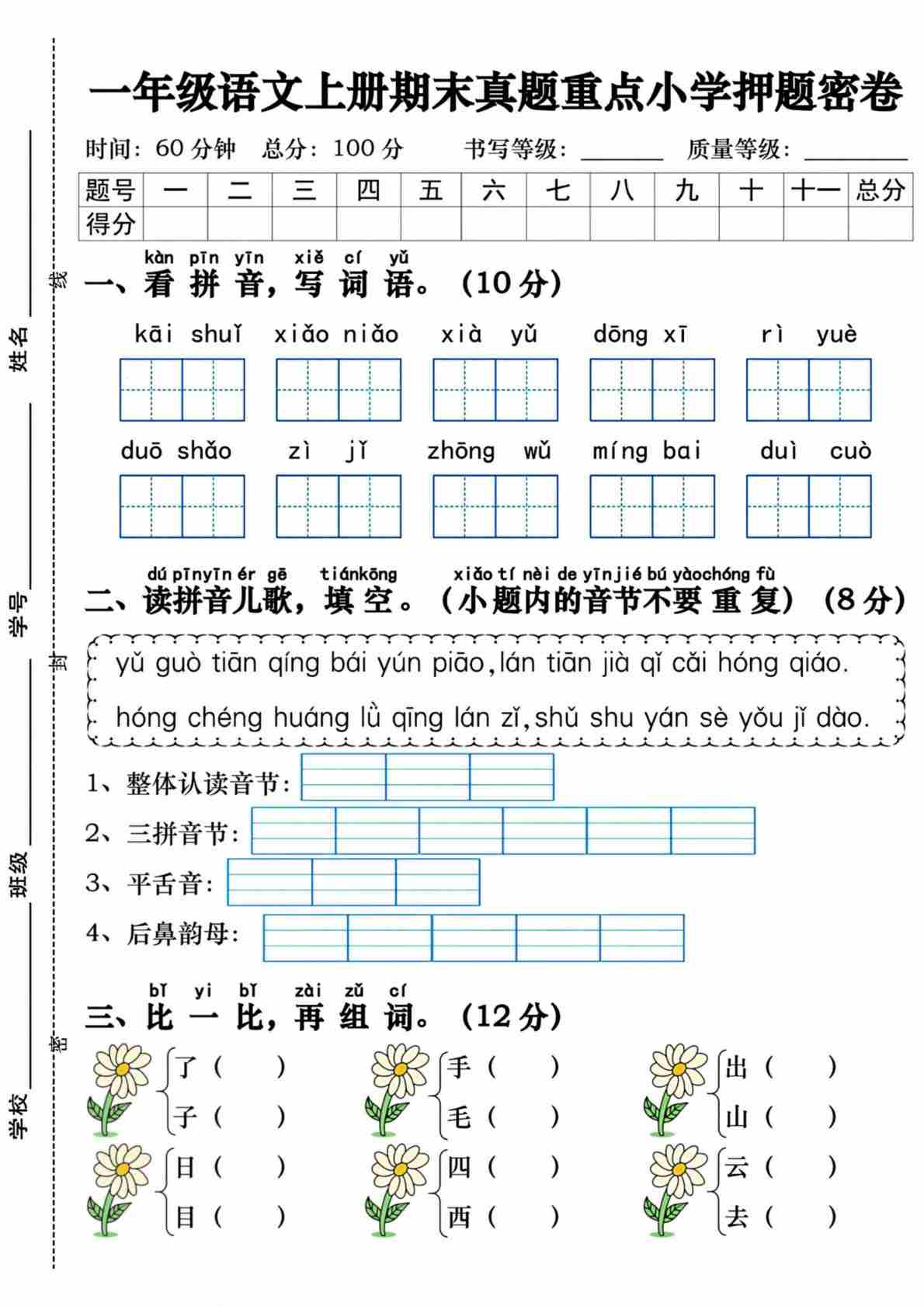 一(上)语文【期末拔尖真题测试卷(含答案5页)】