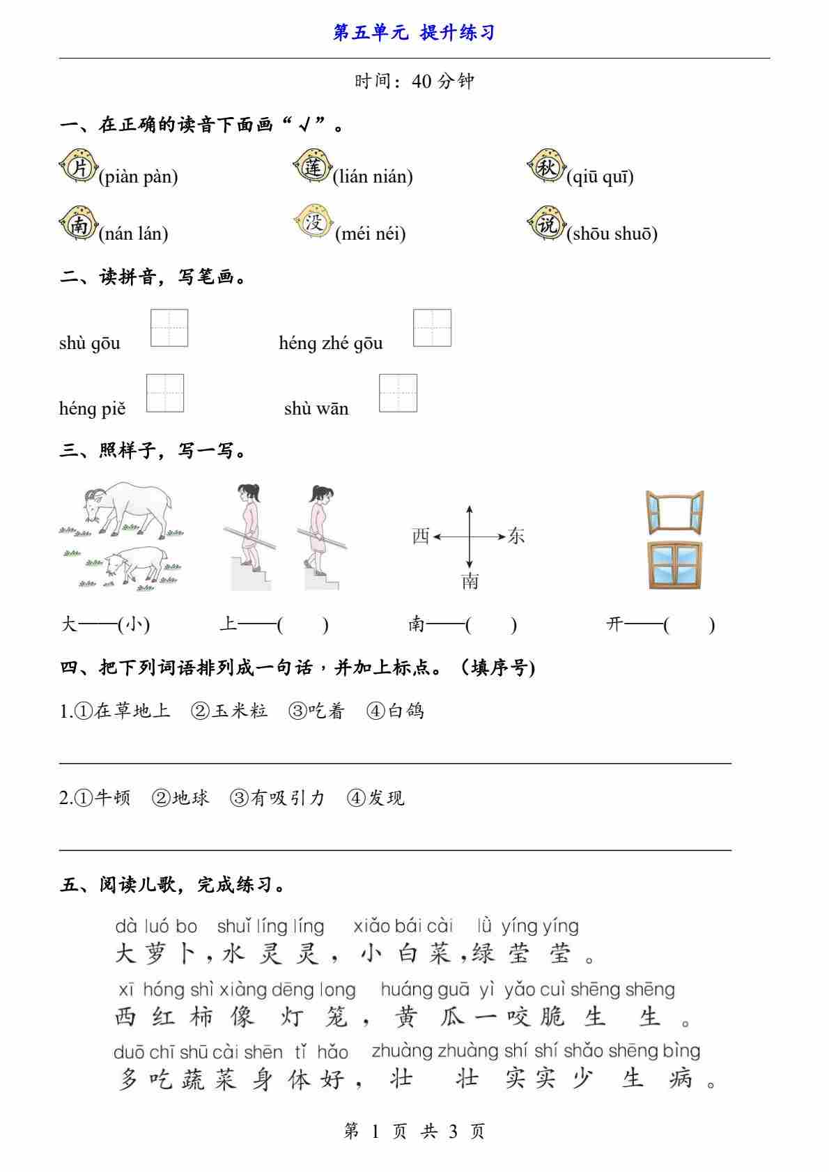 新一上语文第五单元提升练习3页