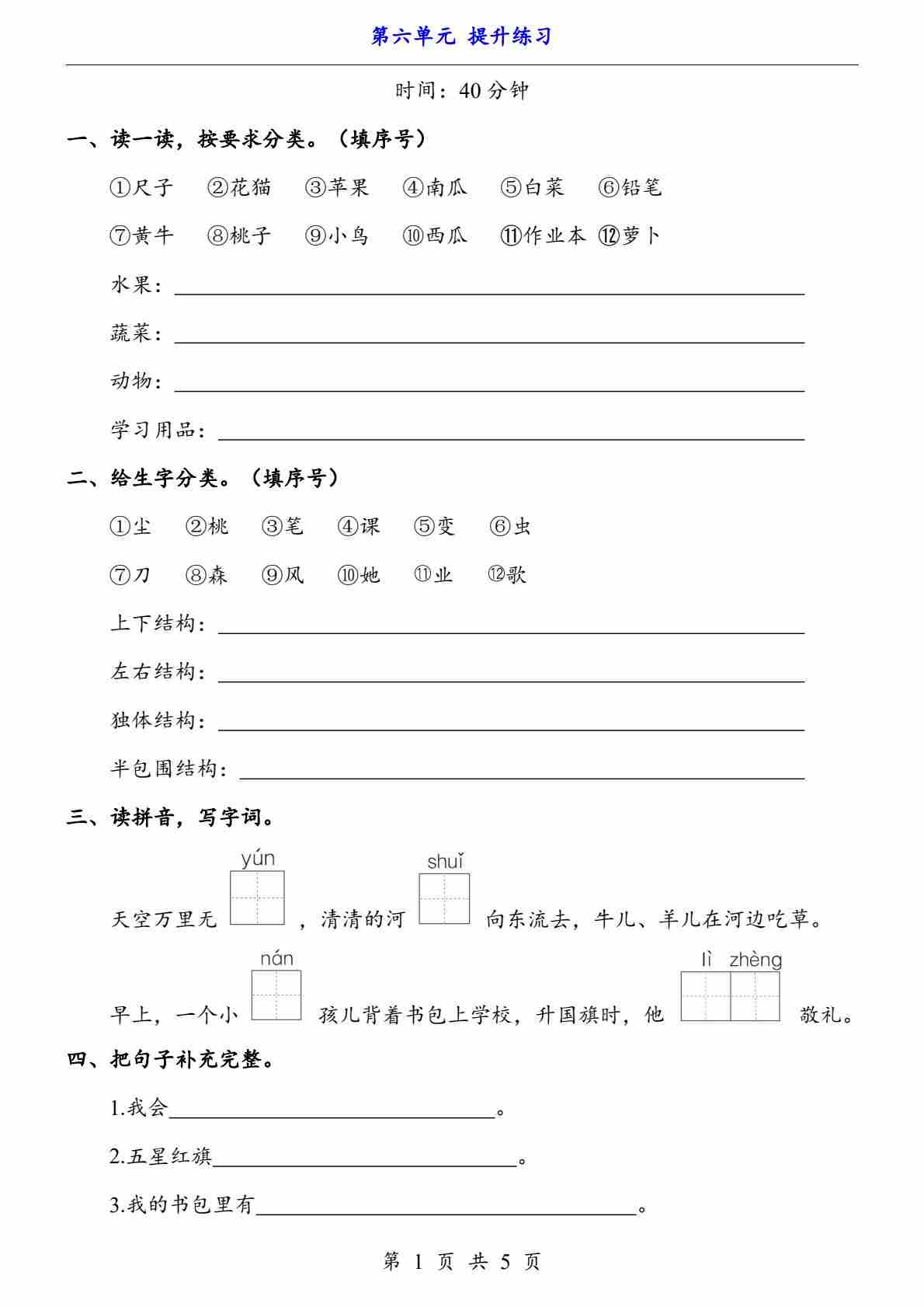新一上语文第六单元提升练习5页