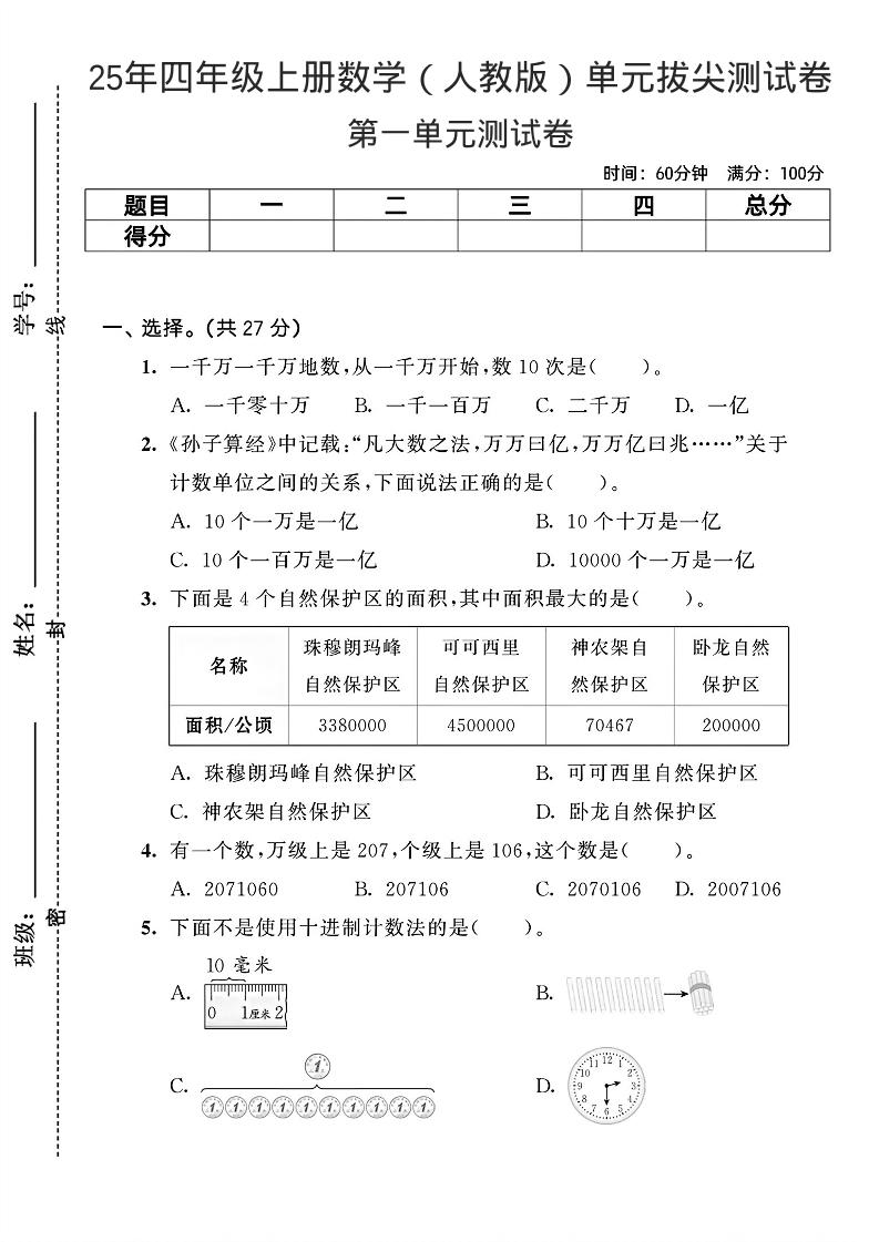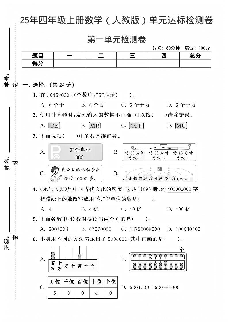 四(上)数学25年(人教版)单元达标检测卷1