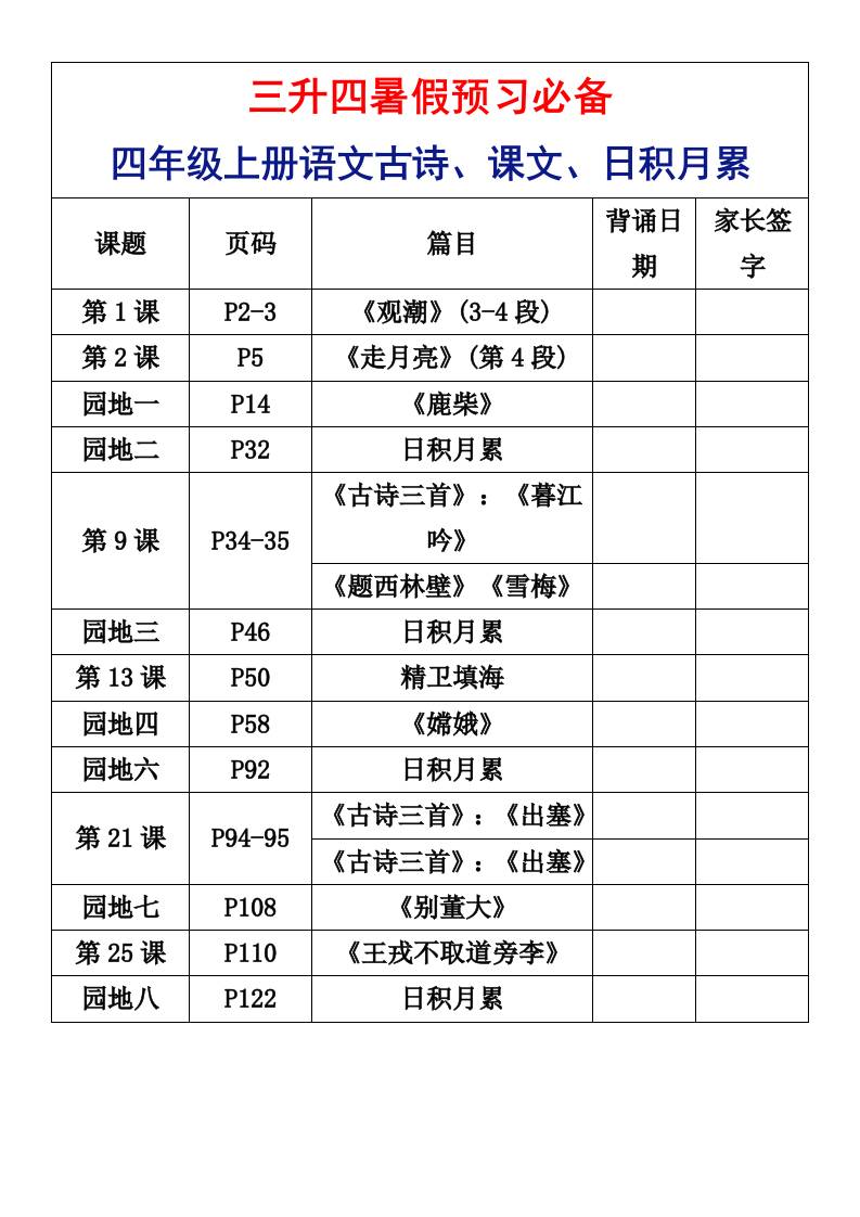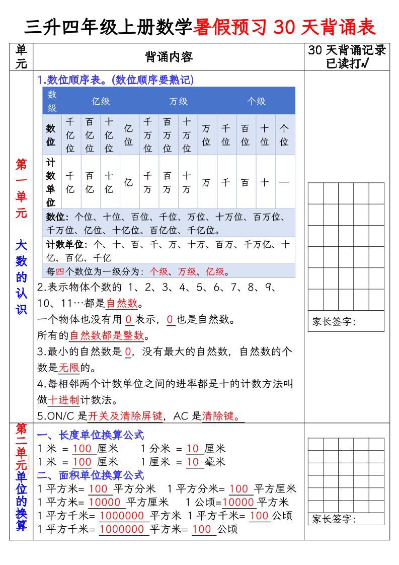 四(上)数学人教版【暑假预习30天背诵表】