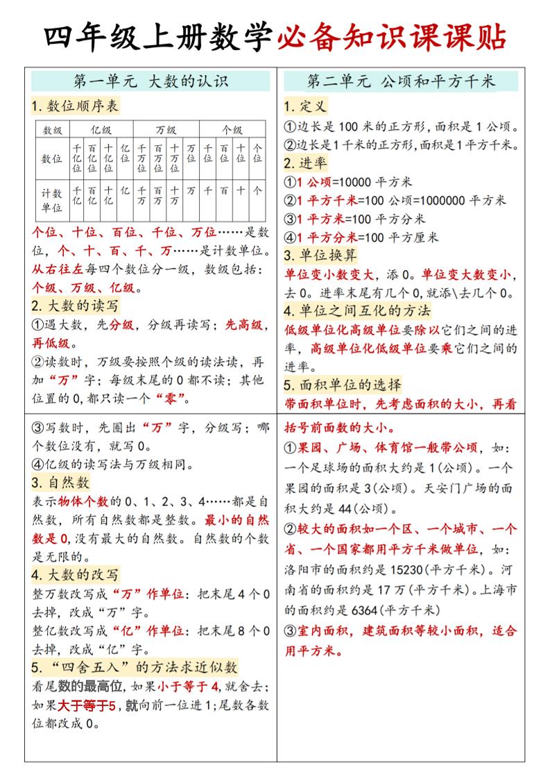 四(上)数学人教版:【必备知识点课课贴】