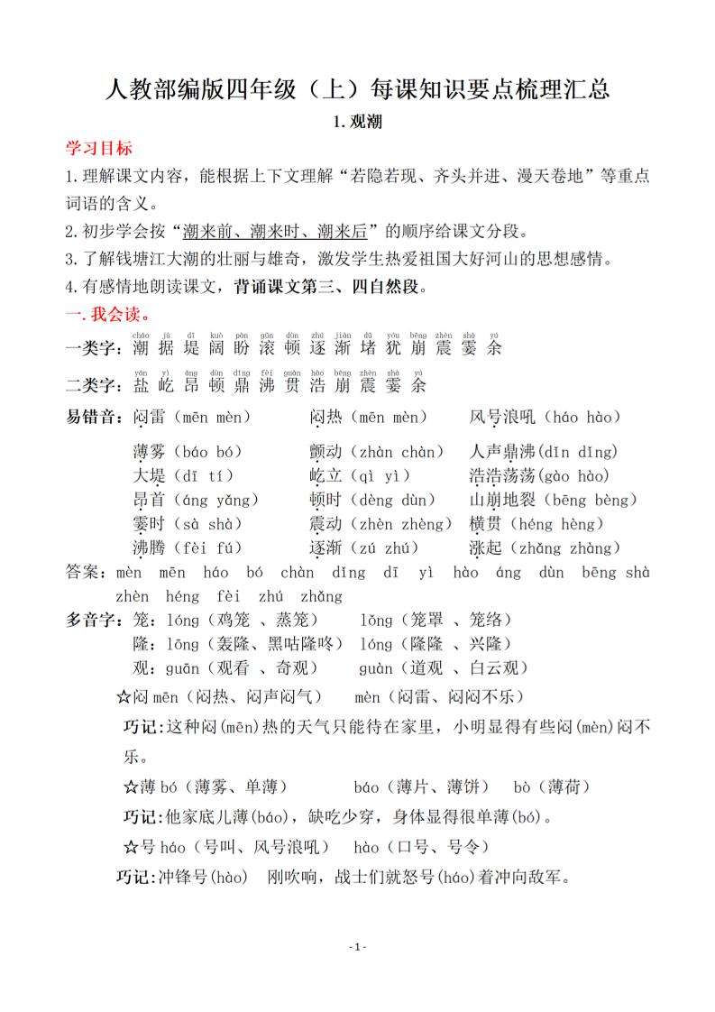 四(上)语文每课常考知识点