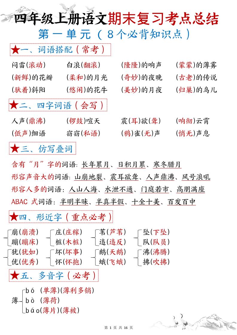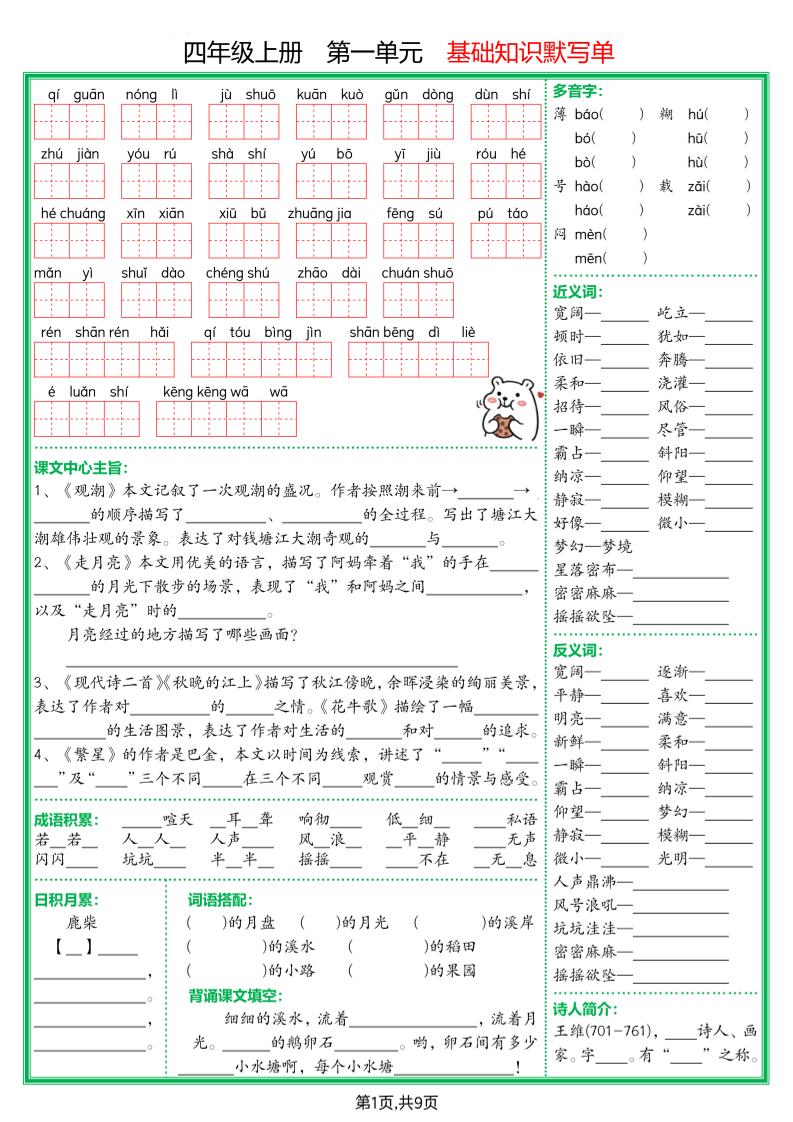 四(上)语文【25秋1-8单元基础知识默写单(含答案18页)