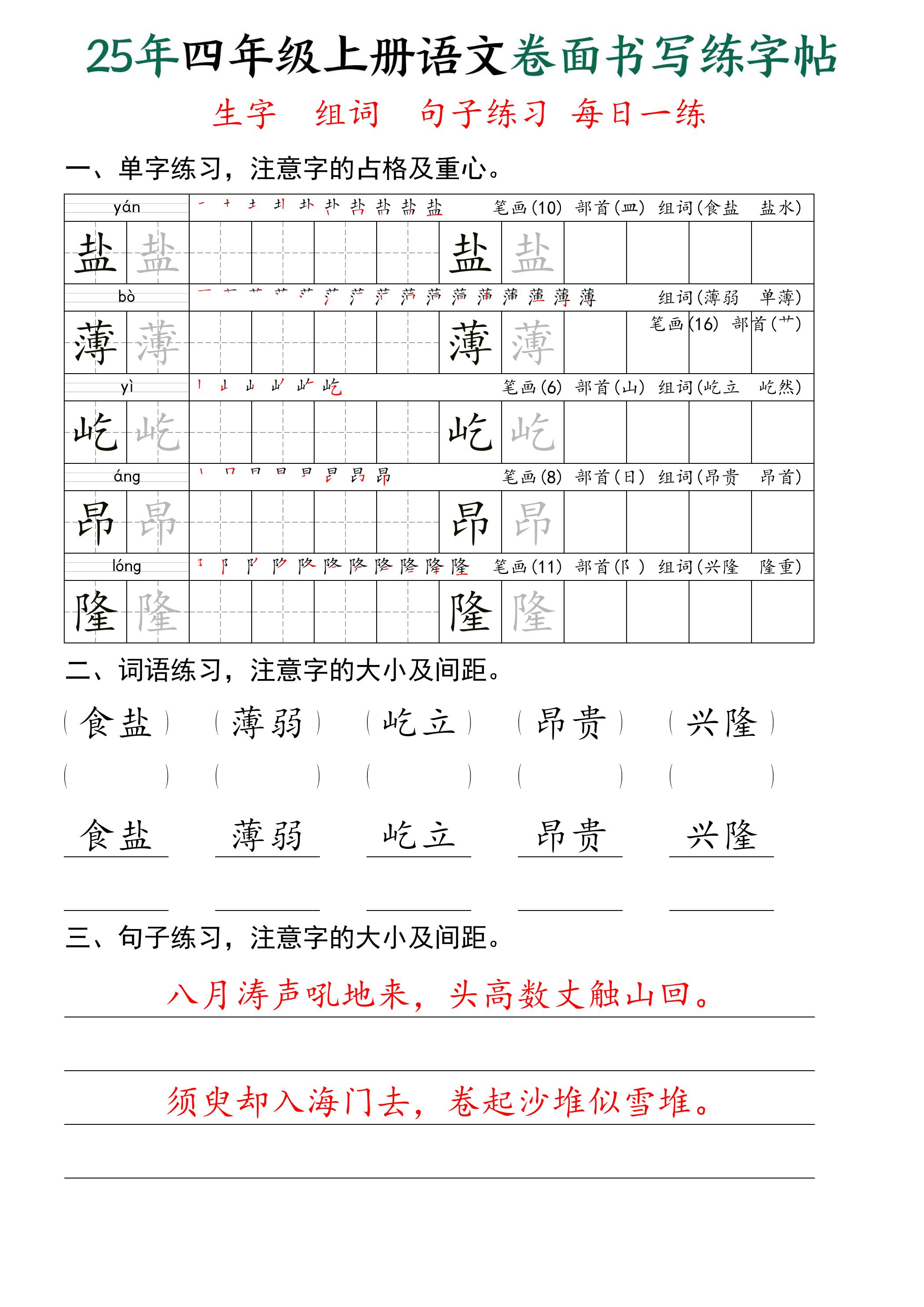 四(上)语文【25年新版暑假练习(识字表)字帖46页】