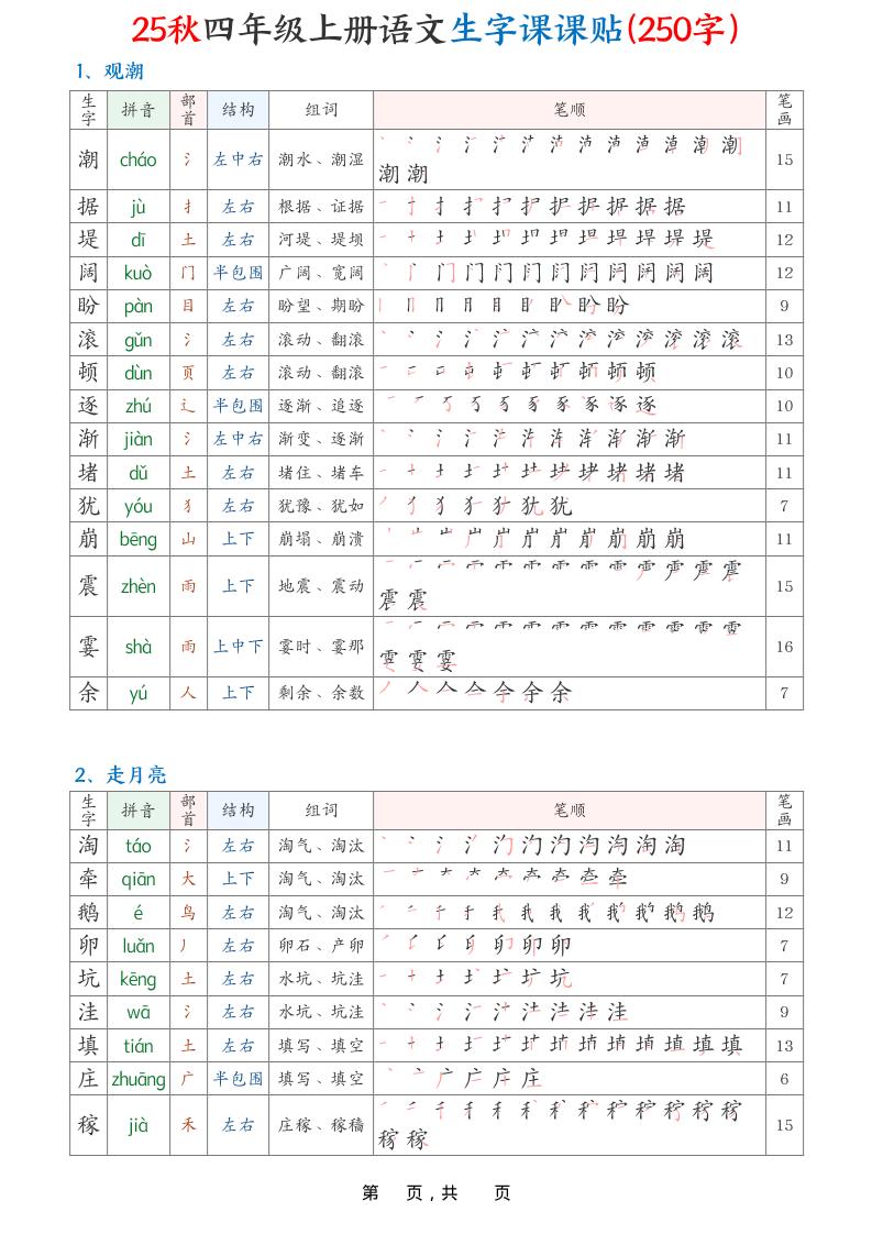 四(上)语文【25秋生字课课贴(生字组词笔顺笔画250字)12页