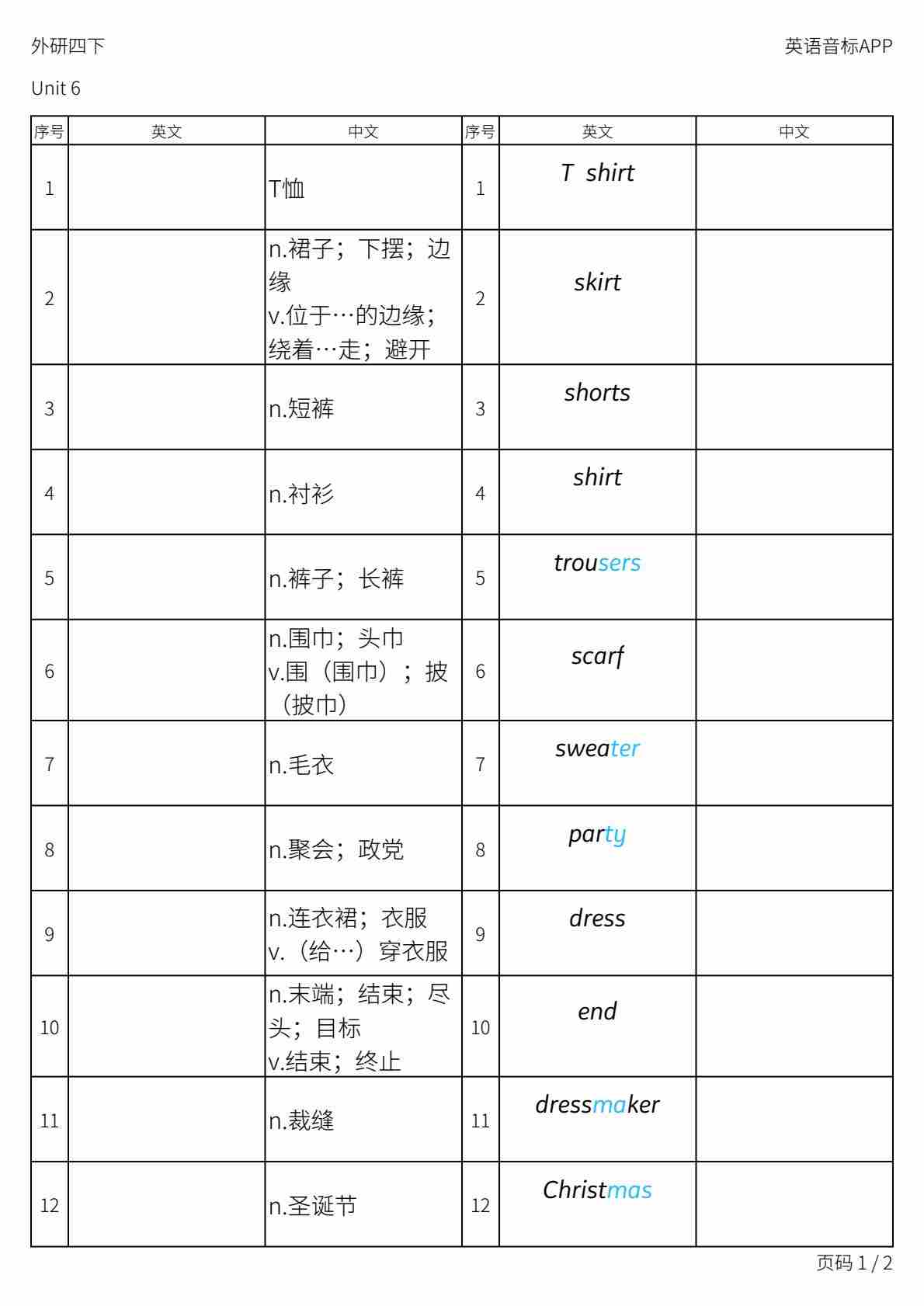 外研版英语四下单词Unit 2