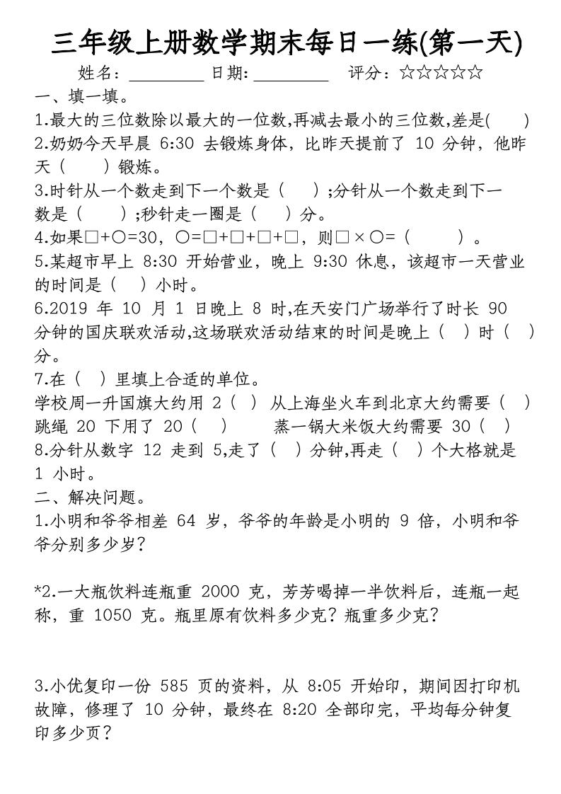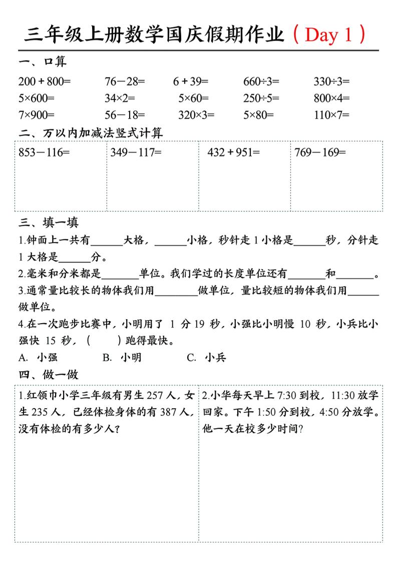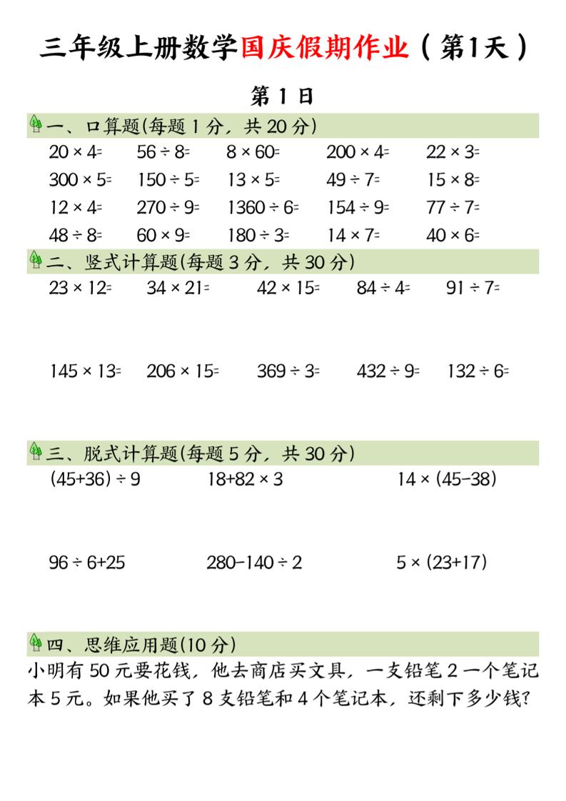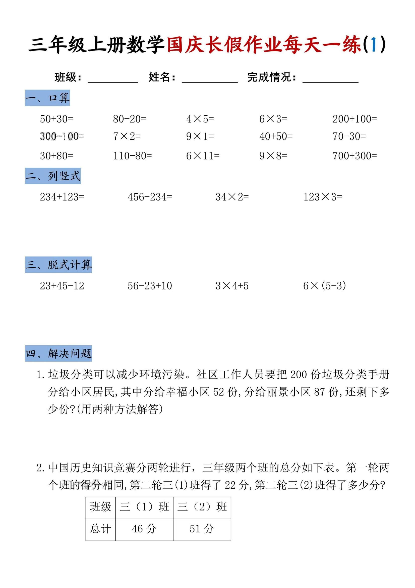 三(上)2025秋通用版数学【国庆长假作业每天一练(8页)】