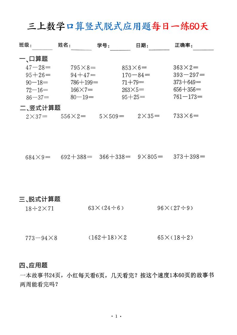 三(上)数学口算竖式脱式应用题每日一练60天(60页)