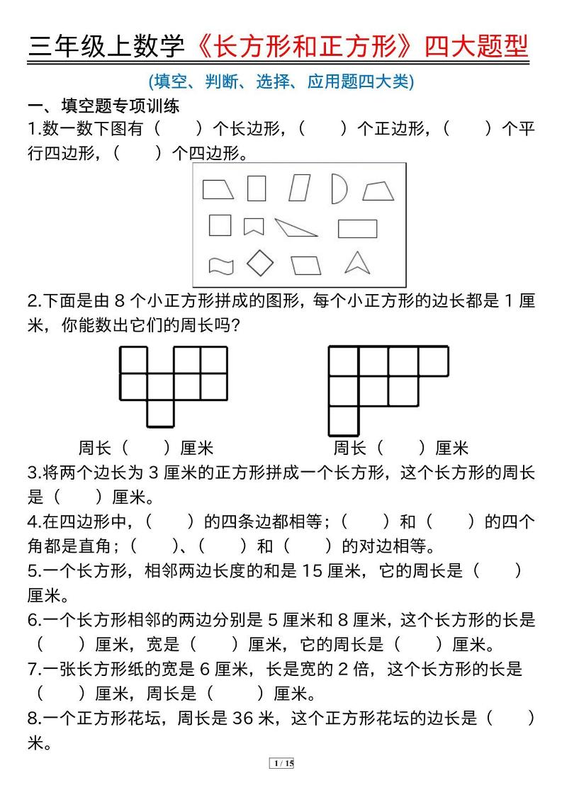 2025秋三上数学长方形和正方形四大题型(15页)