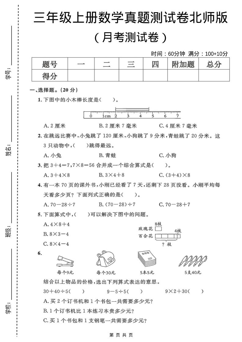 三(上)数学三位数加减混合运算60天30页
