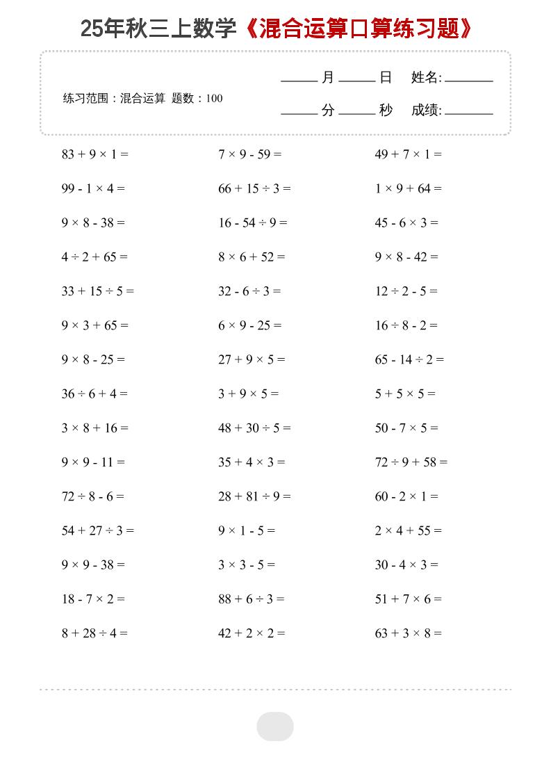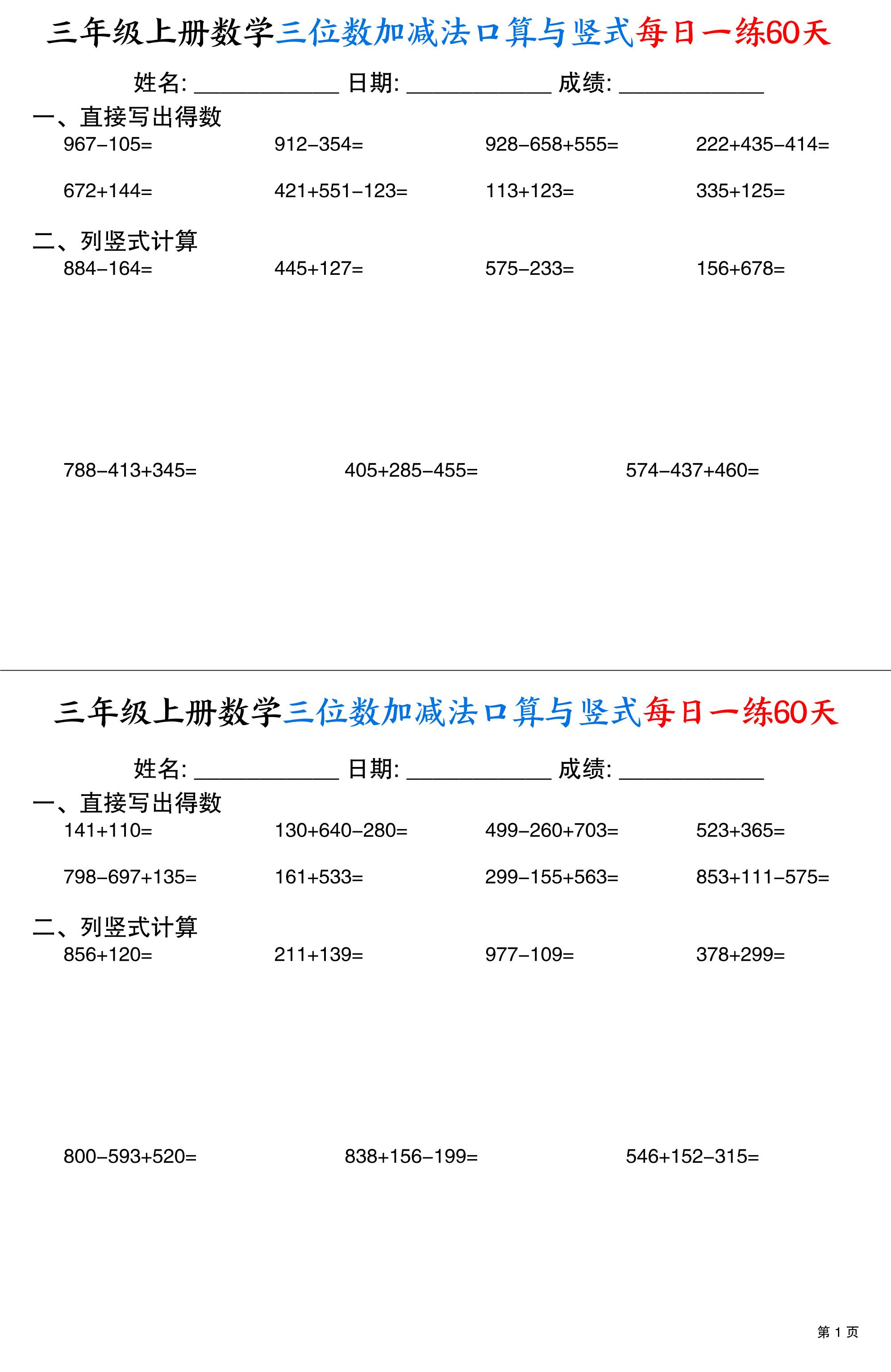 三(上)数学通用版【三位数加减法口算与竖式每日一练60天(30页)】