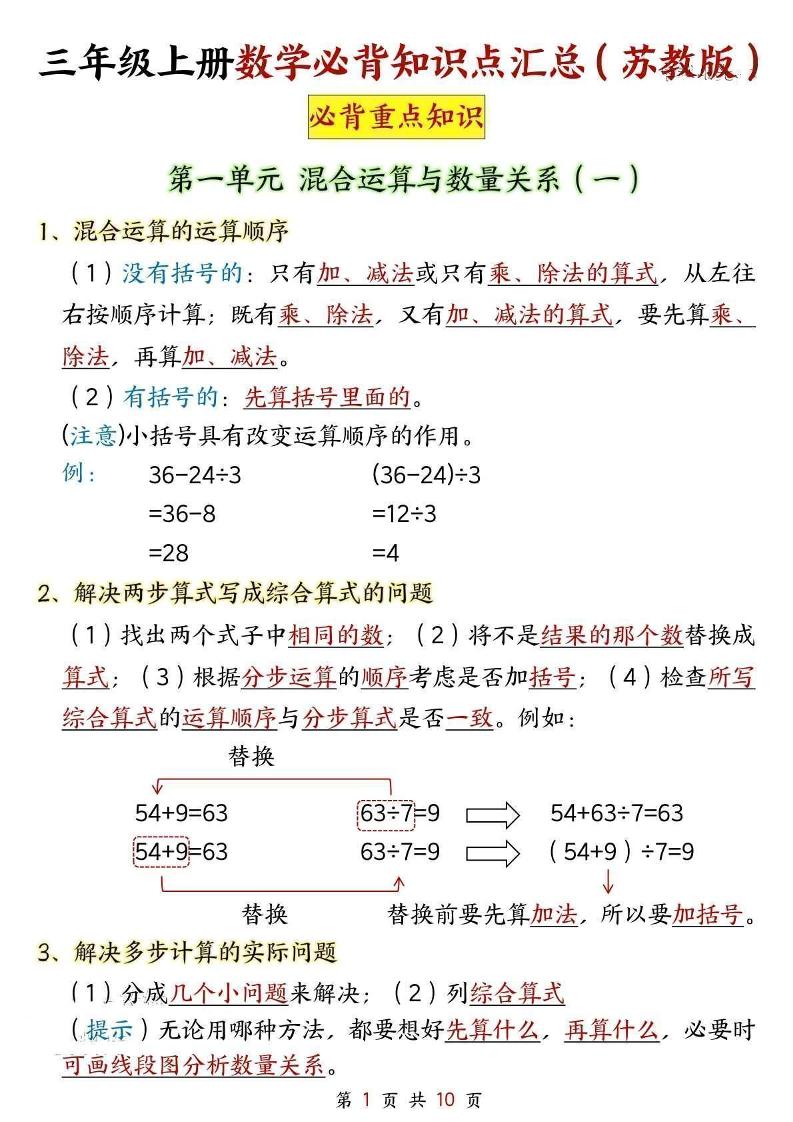 三(上)数学 苏教版【25秋-必背知识点汇总】