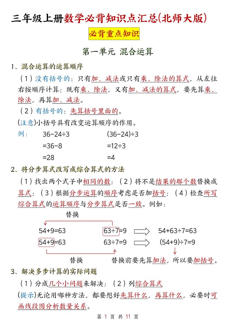 三上北师大版数学【25秋-知识点汇总】