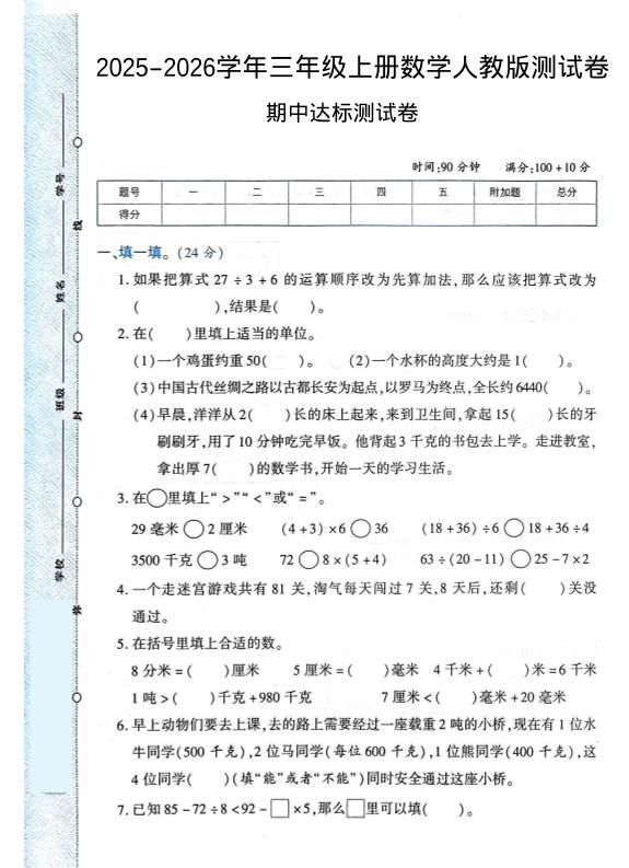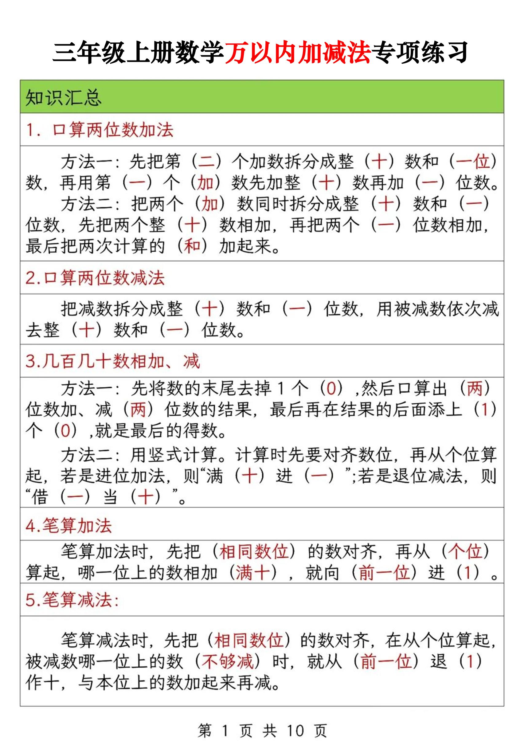 三(上)25秋数学万以内数的加减法应用题(10页)