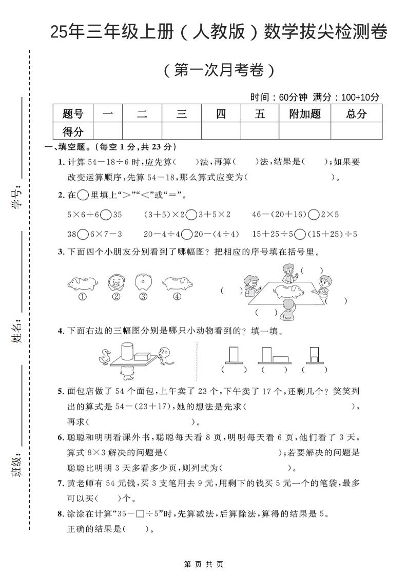 三(上)2025秋(人教版)数学达标检测卷(第一次月考卷)