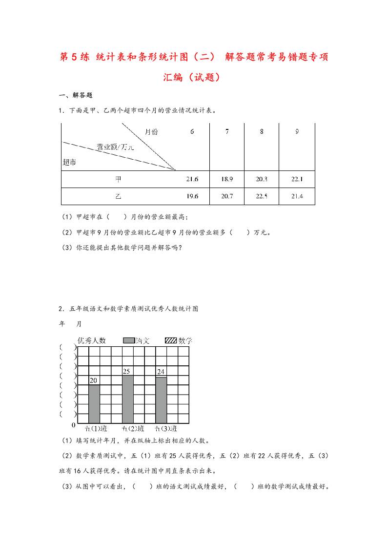 五(上)数学苏教版:(易错专项练)统计表和条形统计图(二) 解答题常考易错题专项汇编(试题)小学数学五年级上册(苏教版)