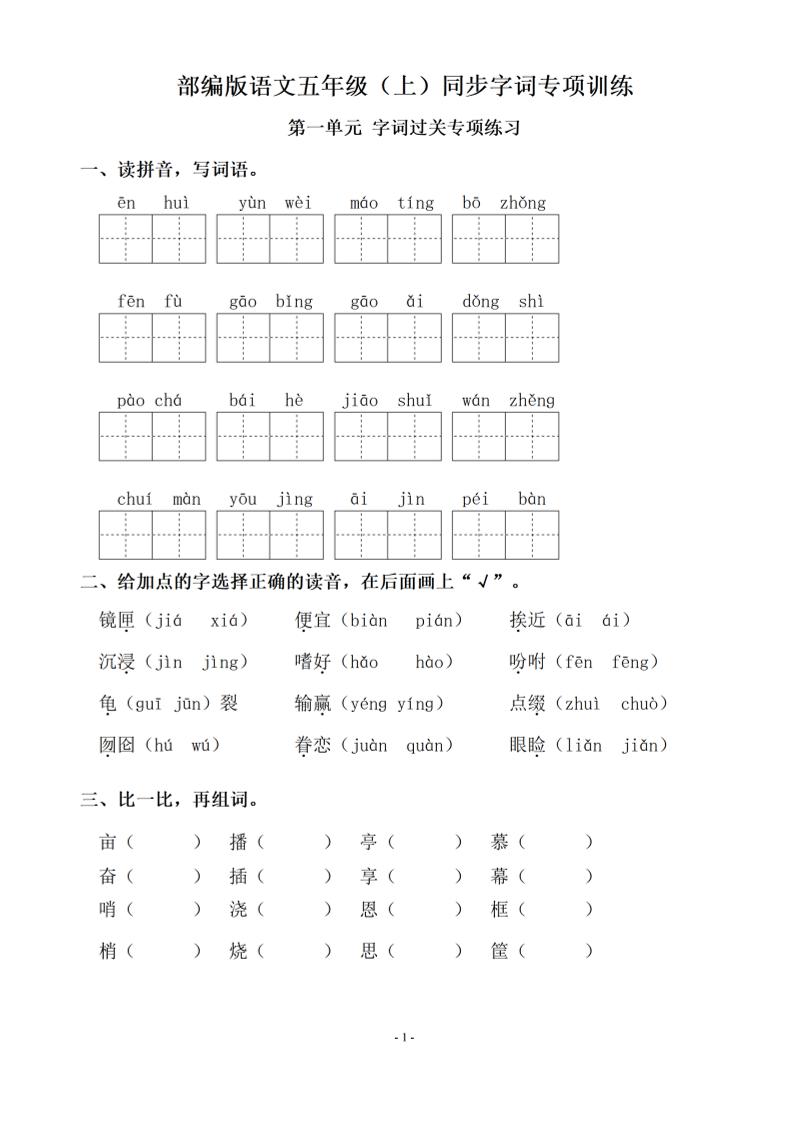 五(上)语文1-8单元字词过关专项训练
