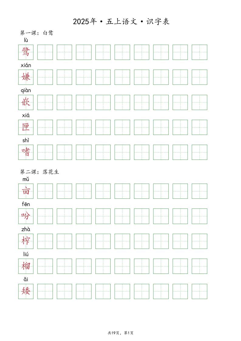 五(上)语文【2025年-抄写识字表(19页)】