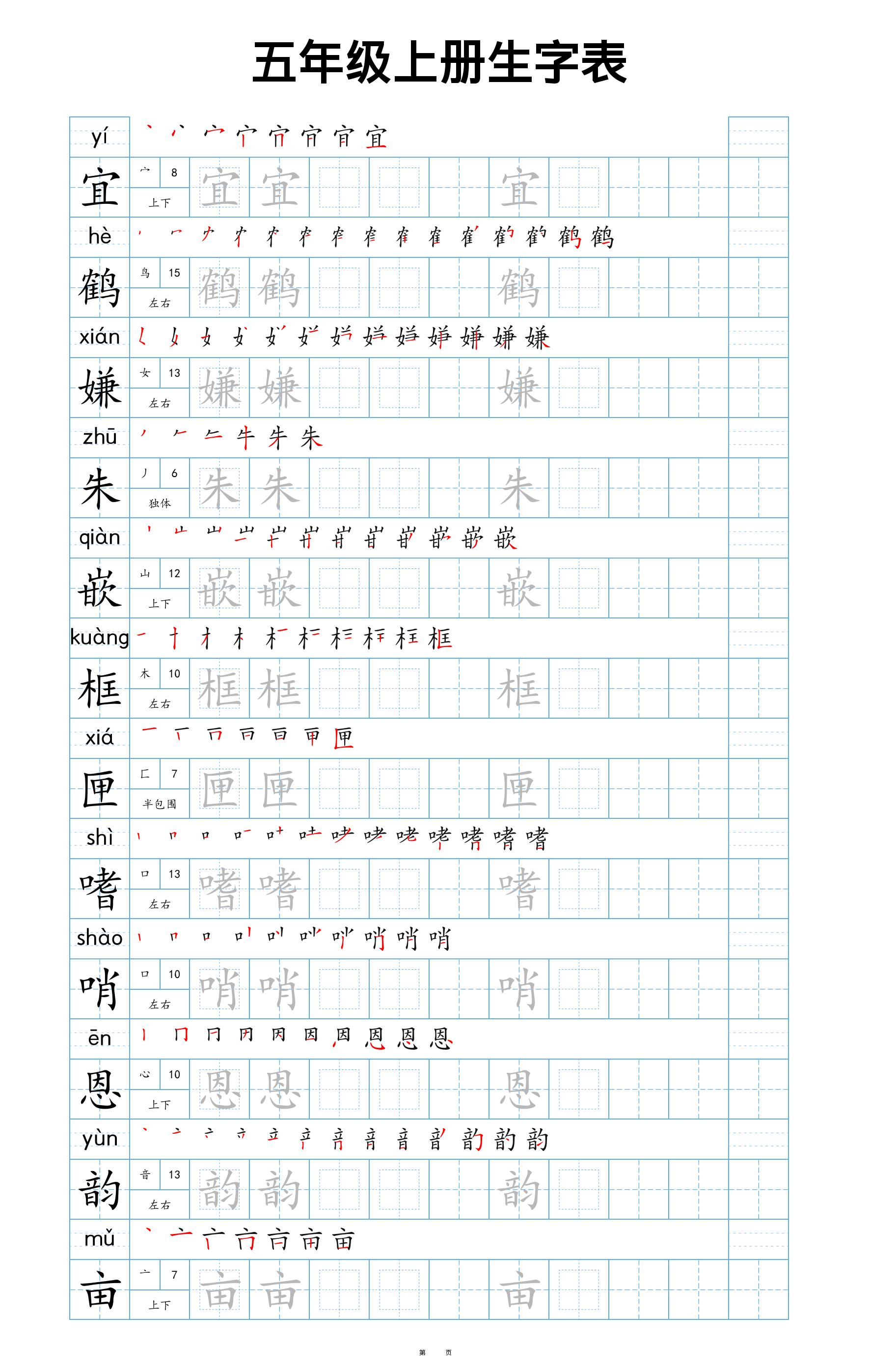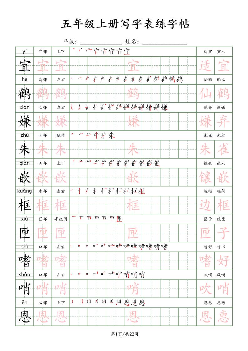 五(上)语文写字表练字帖(22页)楷体