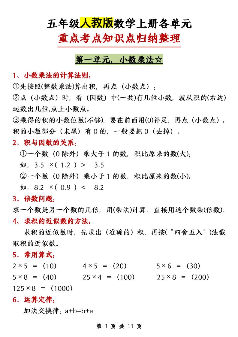 五(上)数学人教版【25秋-各单元知识点归纳整理】