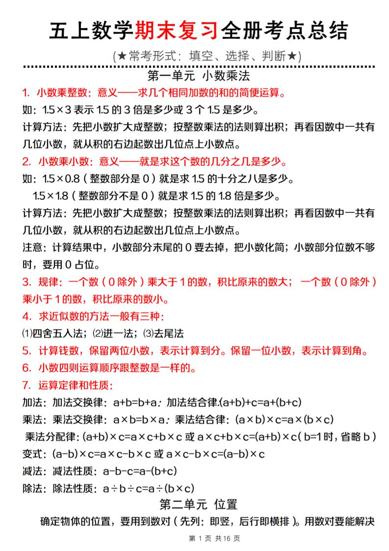 五(上)数学人教版期末复习全册考点总结