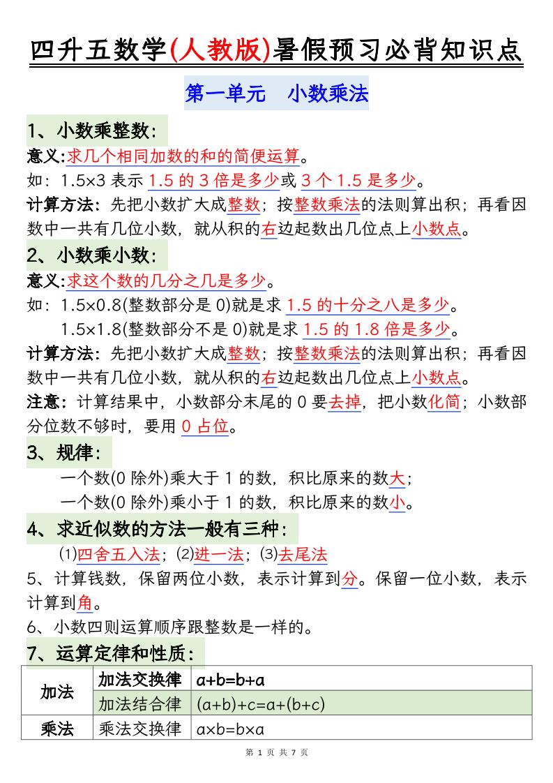 五(上)数学人教版【晨读晚默必背知识点】