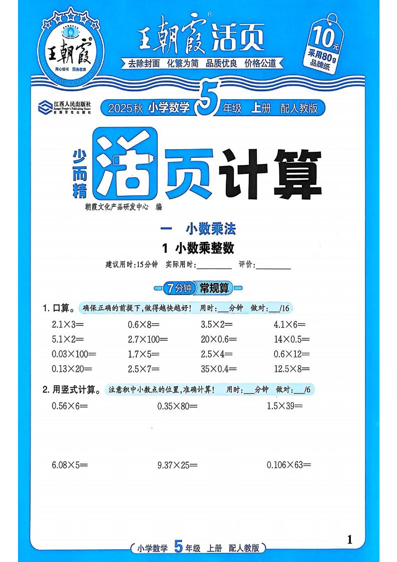 五(上)数学人教版【2025秋-王朝霞活页计算】