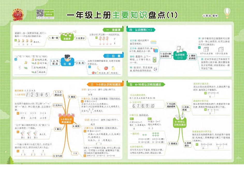 小学数学人教版:1-6上册单元核心考点思维导图一览表