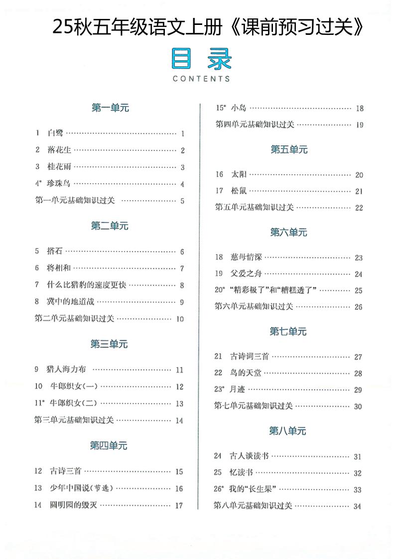 五(上)语文25秋《课前预习过关》(35页)