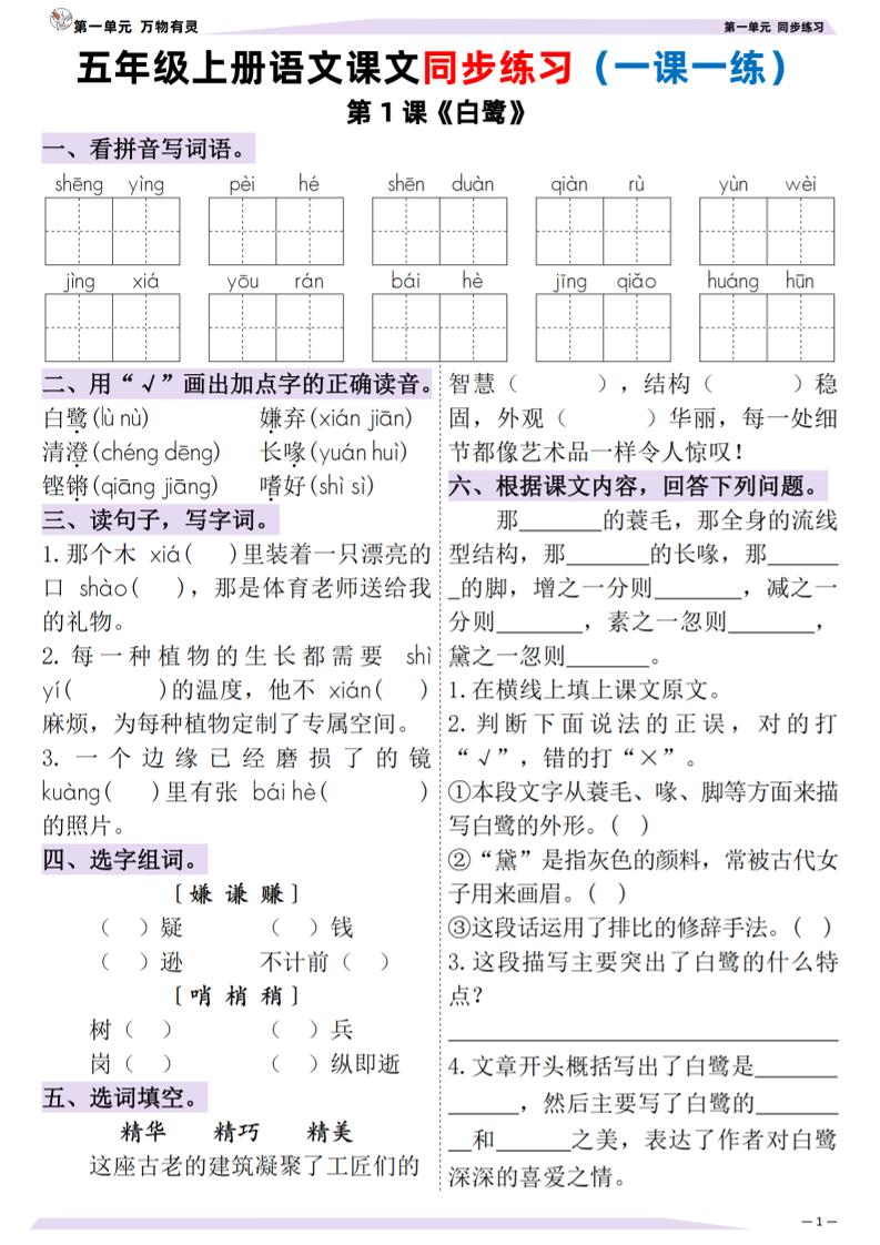 五(上)语文:课文同步练习(一课一练)(含答案)