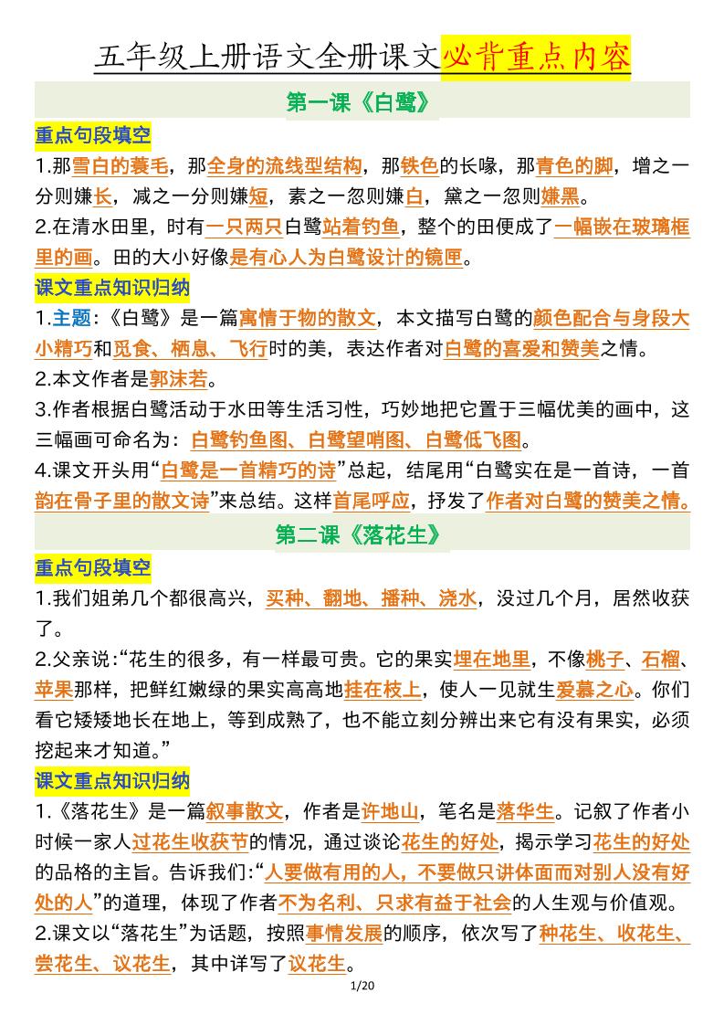 五(上)语文【全册课文必背重点(重点句段填空、课文重点知识归纳)】