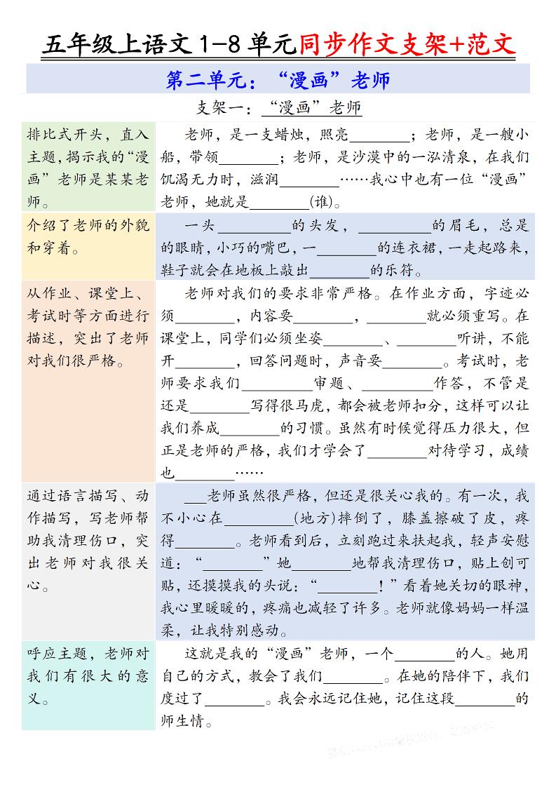 五(上)语文:同步作文填空式写作指导(参考答案)