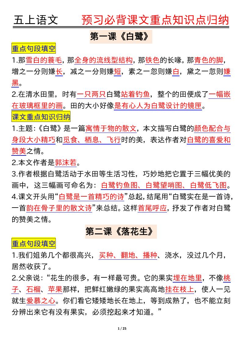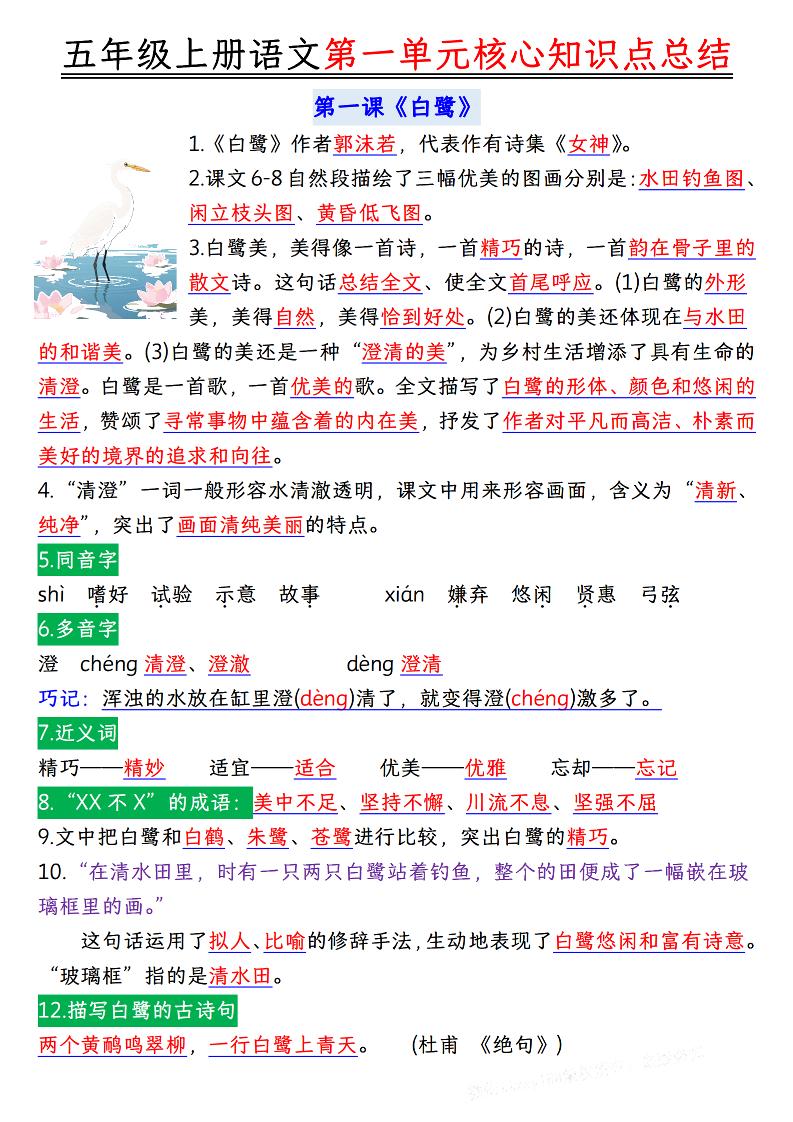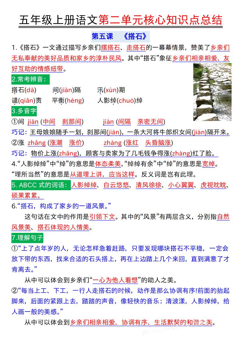 五(上)语文【暑假预习全册重点内容归纳总结】