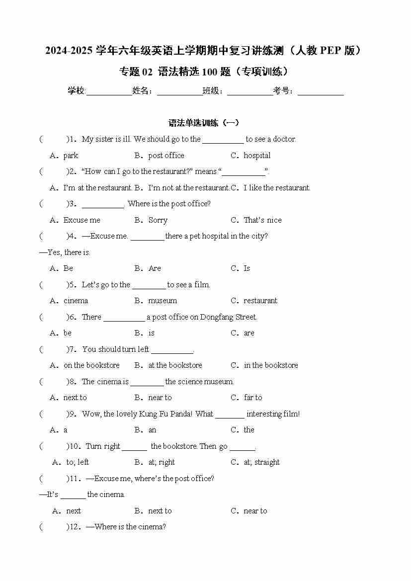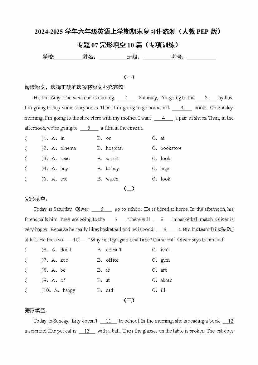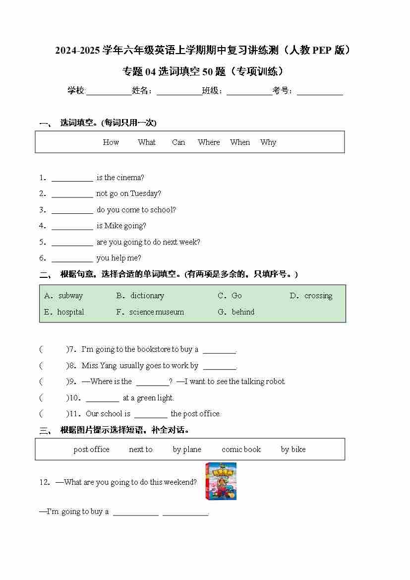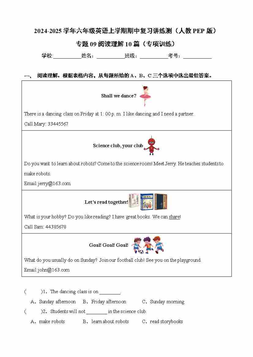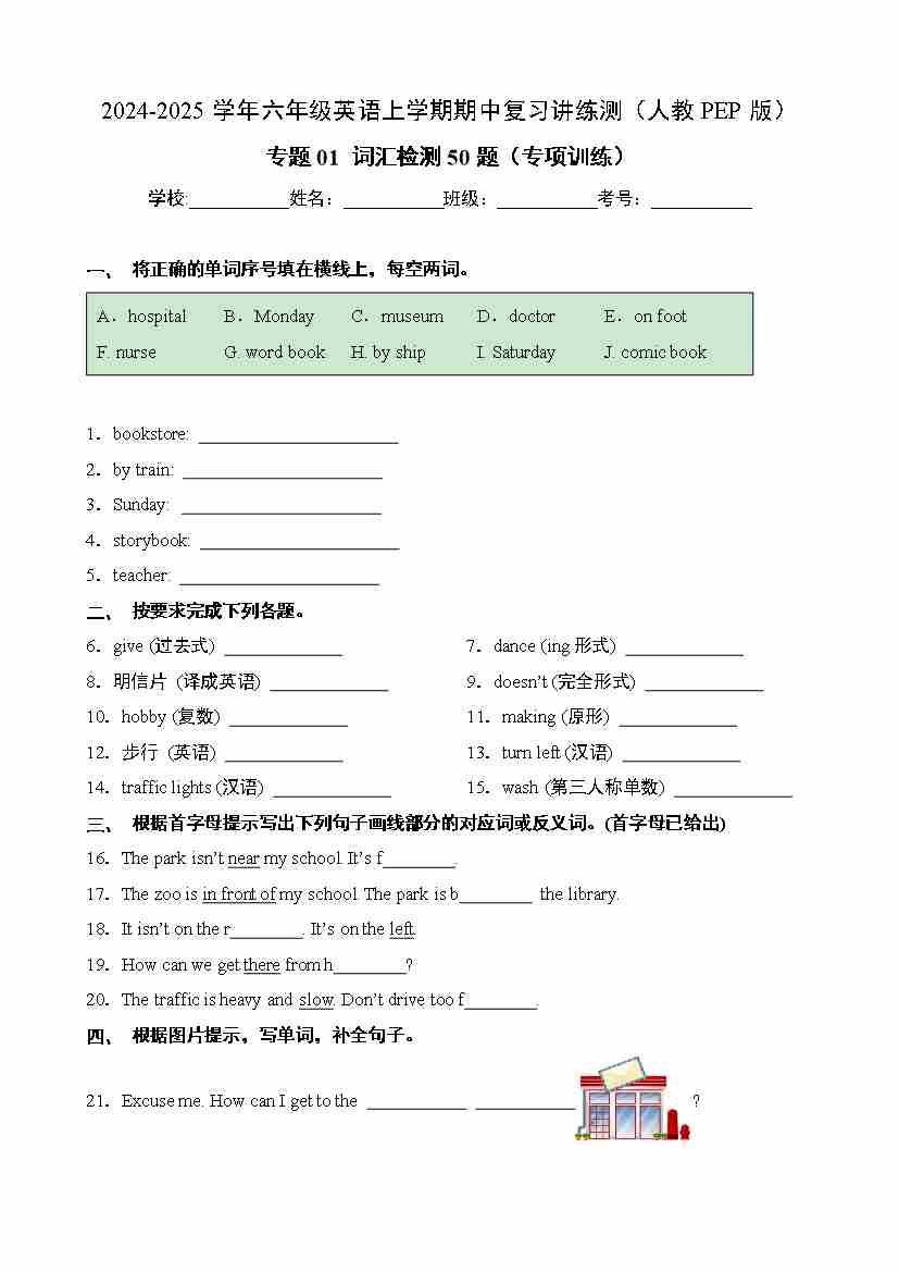 六(上)英语人教PEP版【25秋-小学学霸冲A卷】
