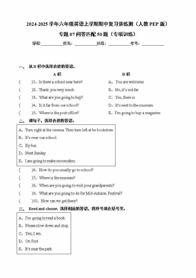 专题07问答匹配50题(专项训练)