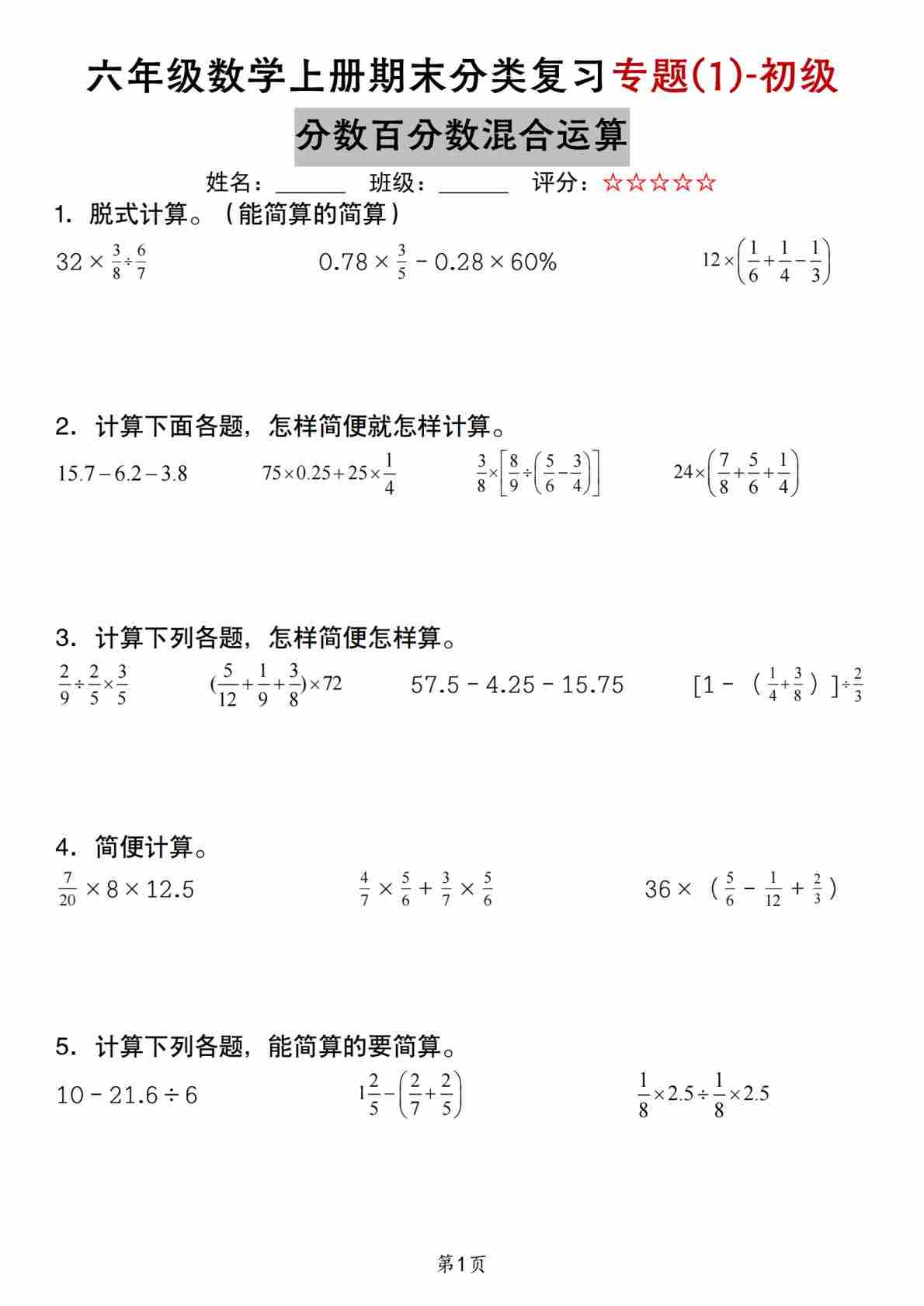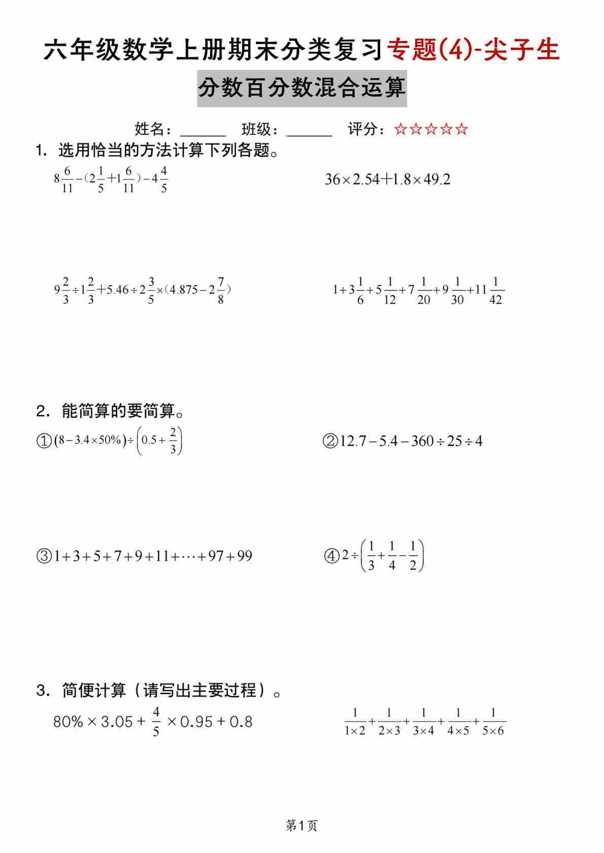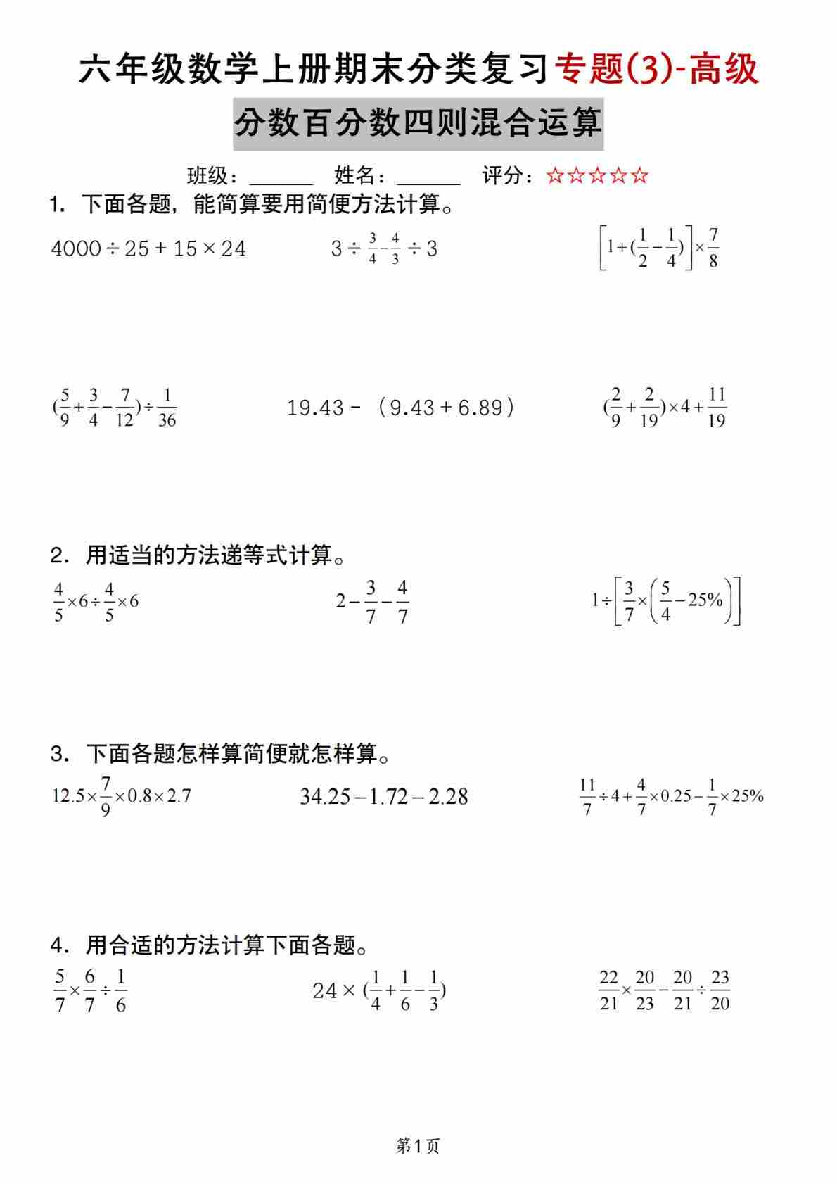 六(上)数学苏教版《六年级数学上册期末分类复习专题(4)-尖子生分数百分数混合运算》_