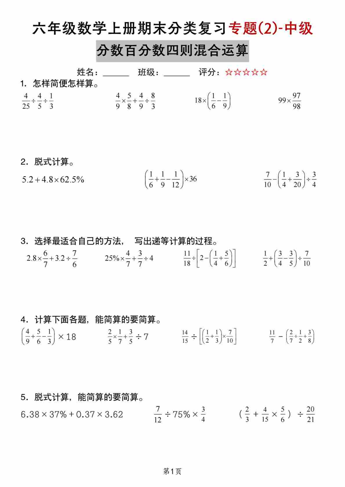 六(上)数学苏教版《六年级数学上册期末分类复习专题(2)-中级分数百分数四则混合运算》_