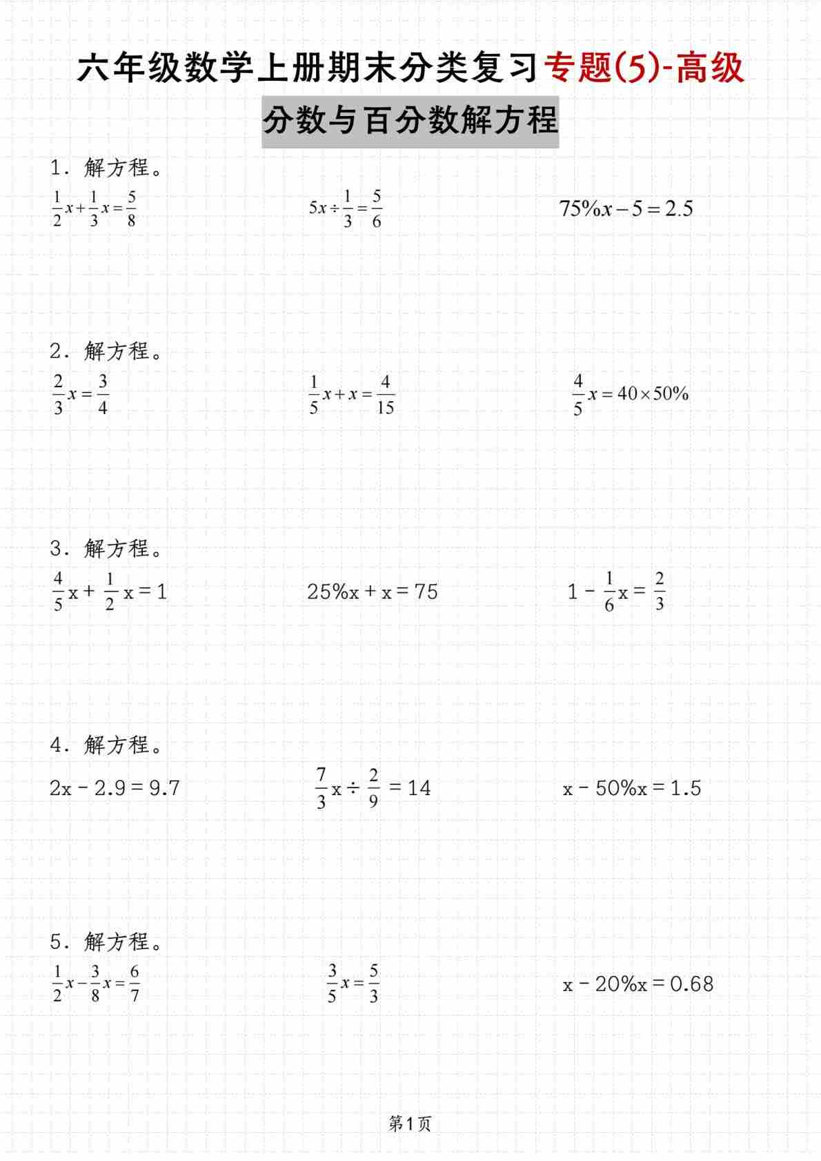 六(上)数学苏教版《六年级数学上册期末分类复习专题(5)-高级分数与百分数解方程》_