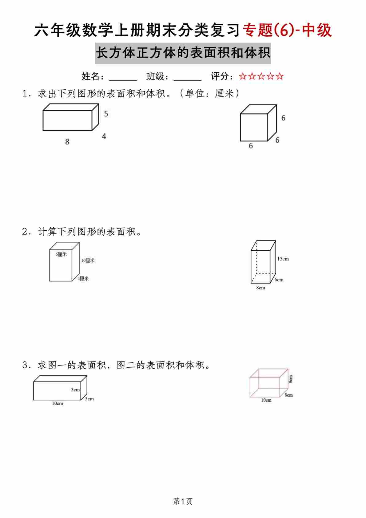 六(上)数学苏教版《六年级数学上册期末分类复习专题(6)-中级长方体正方体的表面积和体积》_