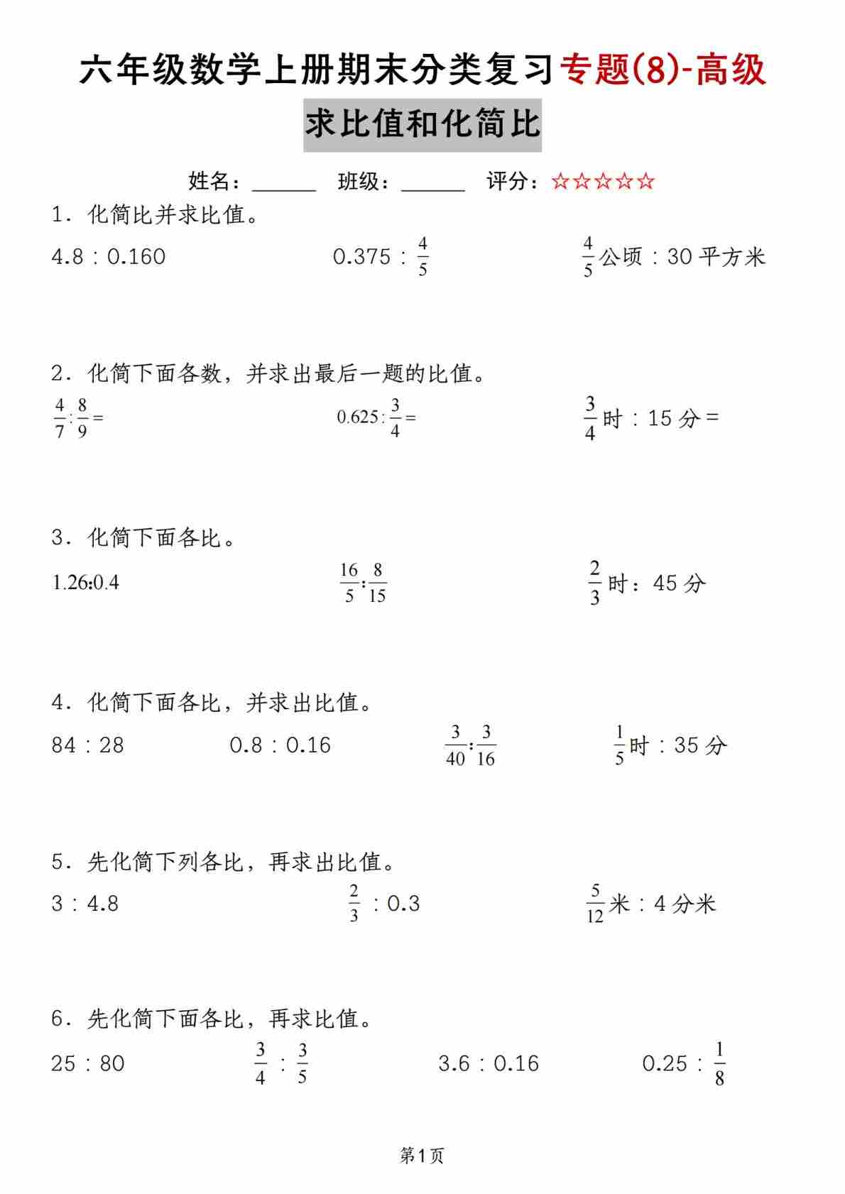 六(上)数学苏教版《六年级数学上册期末分类复习专题(8)-高级求比值和化简比》_