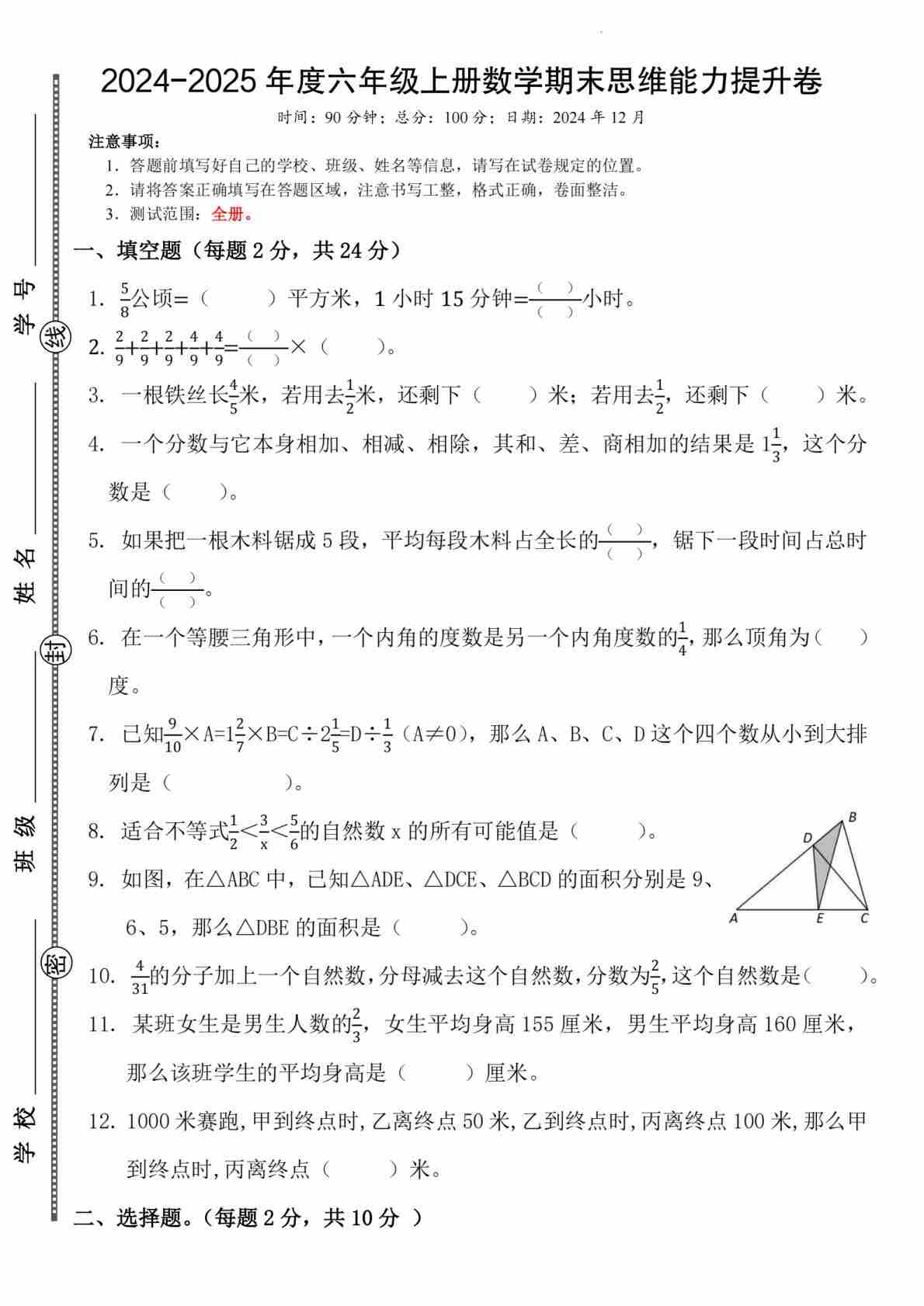 六(上)数学苏教版【2024-2025学年期末思维能力提升卷】