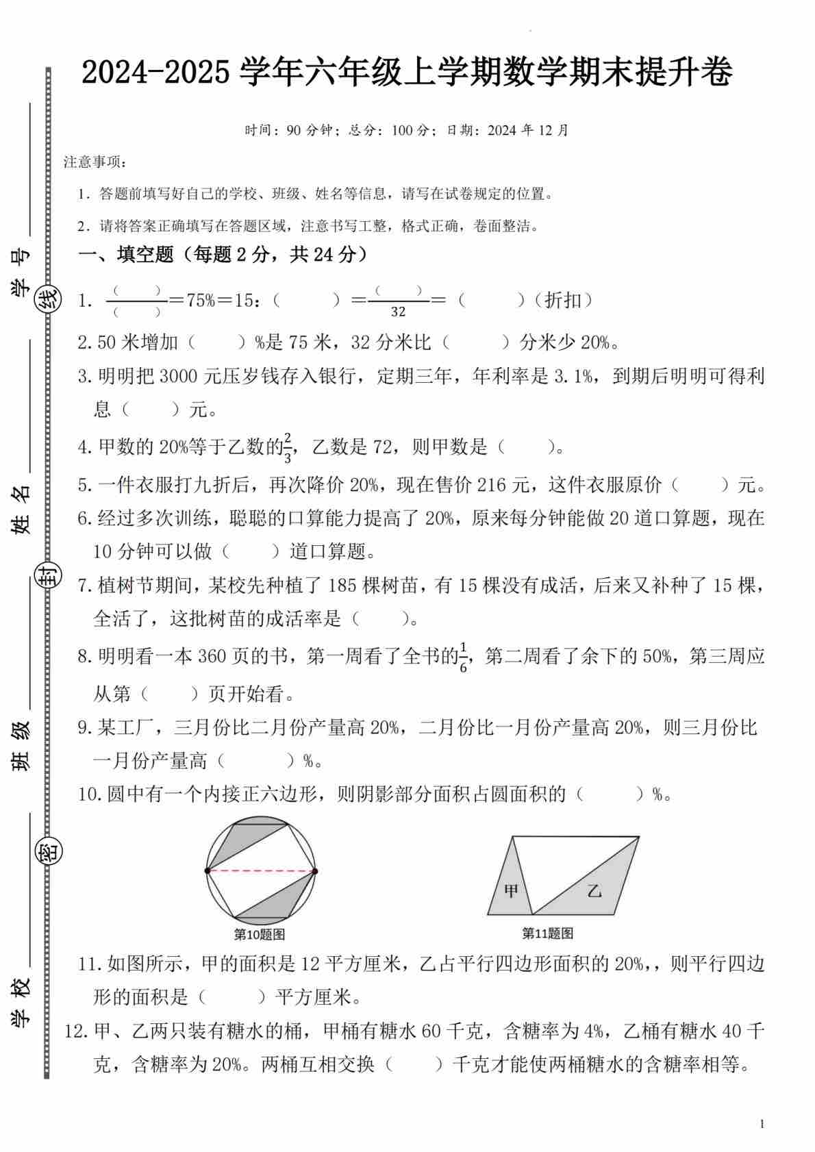 六(上)数学苏教版【2024-2025学年期末提升卷】