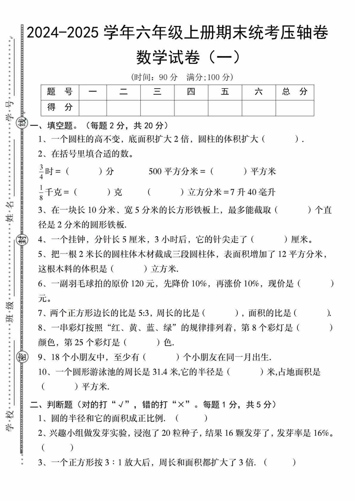 六(上)数学苏教版【2024-2025学年期末统考压轴卷(一)】