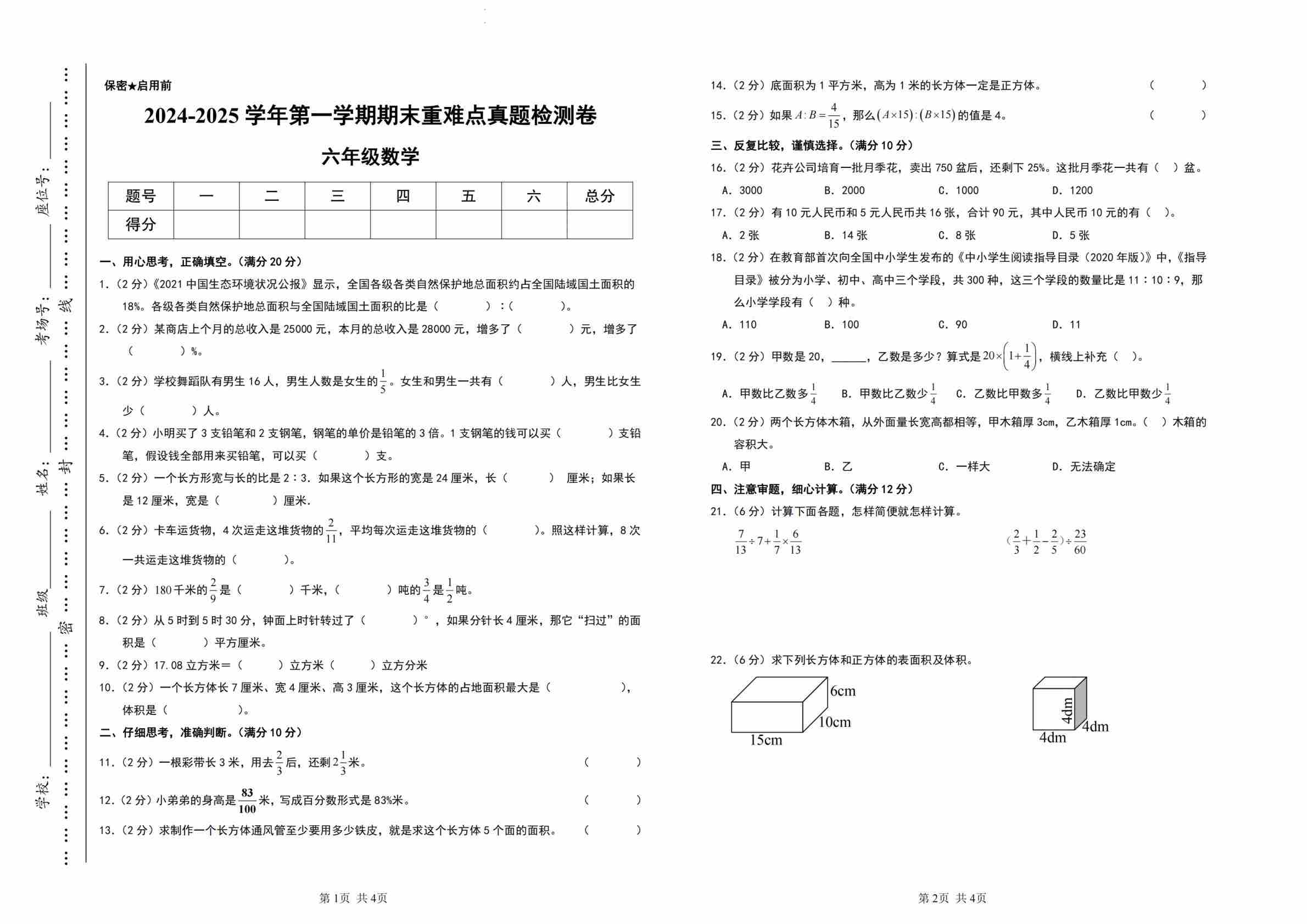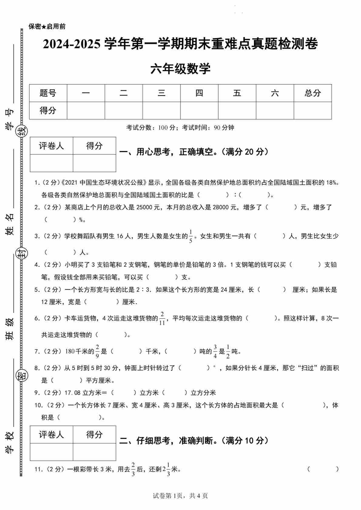 六(上)数学苏教版【2024-2025学年第一学期期末重难点真题检测卷】