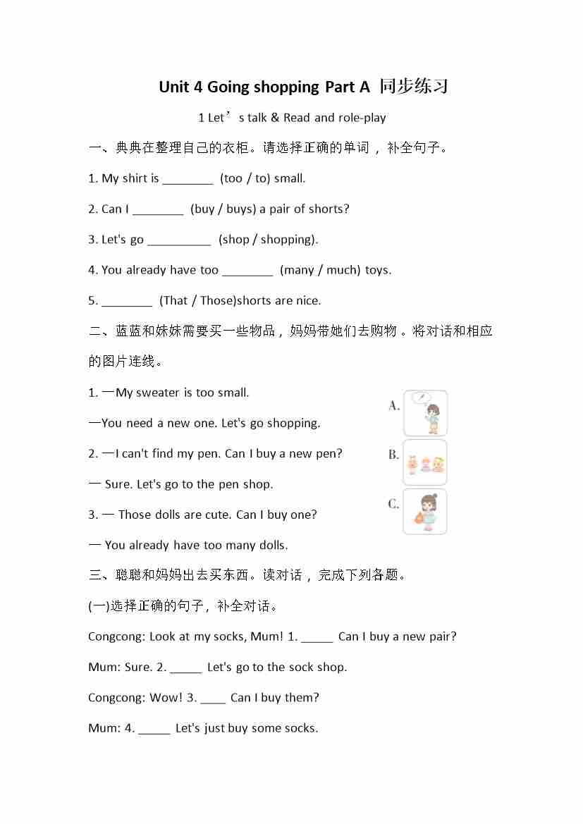 Unit 4 Going shopping PartA 同步练习(含答案)