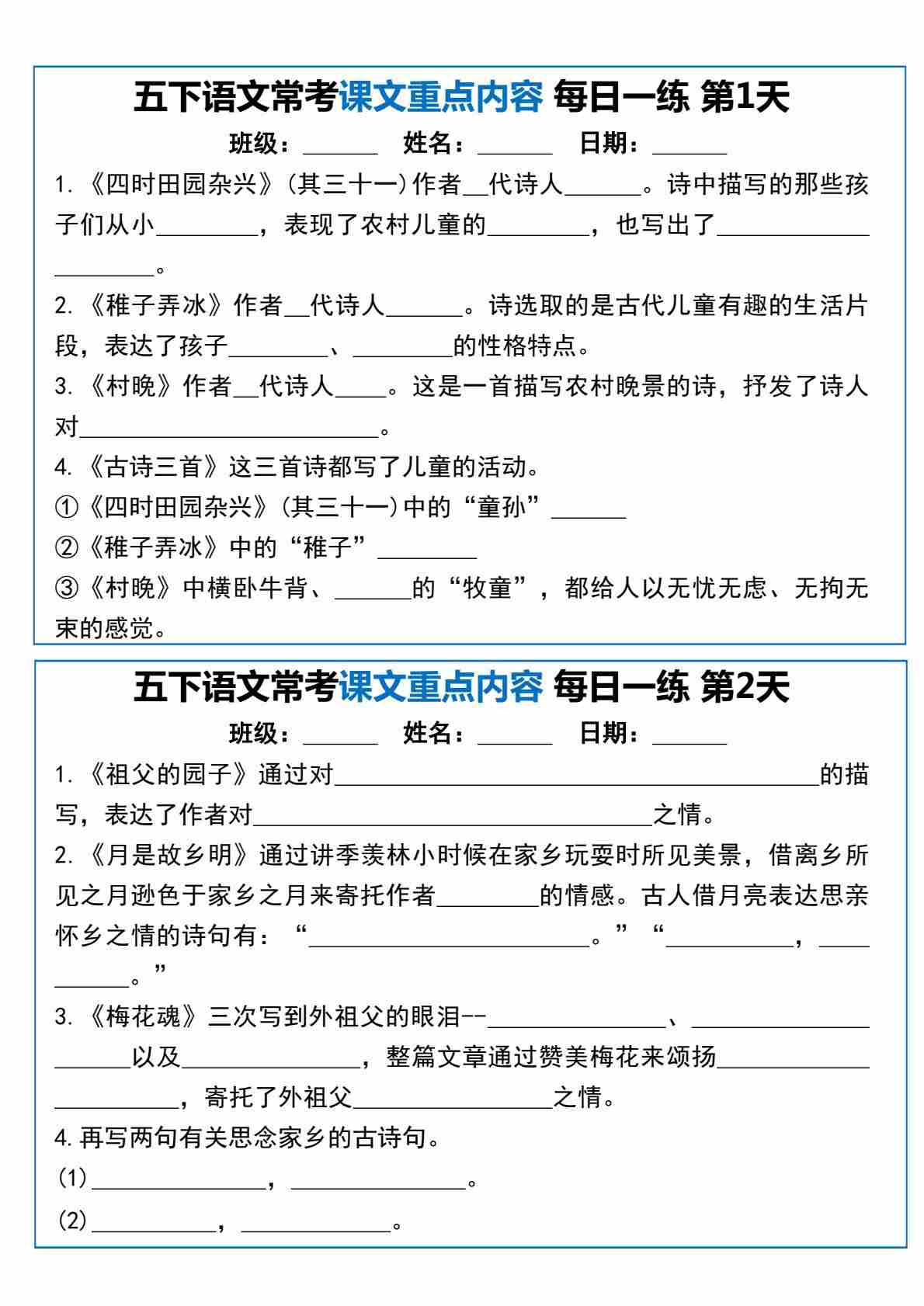 【常考课文重点内容每日一练10天】五下语文