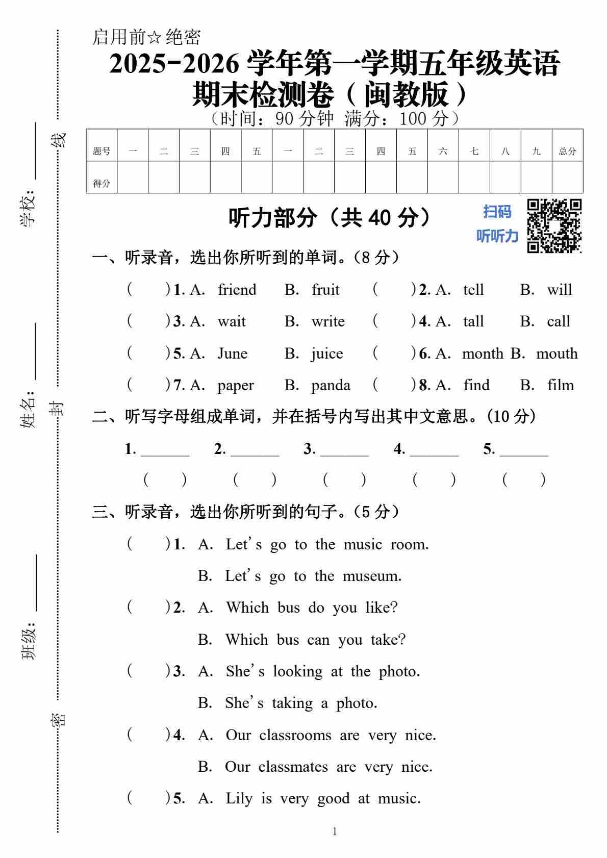 2025-2026学年第一学期五年级英语期末检测卷(闽教版)